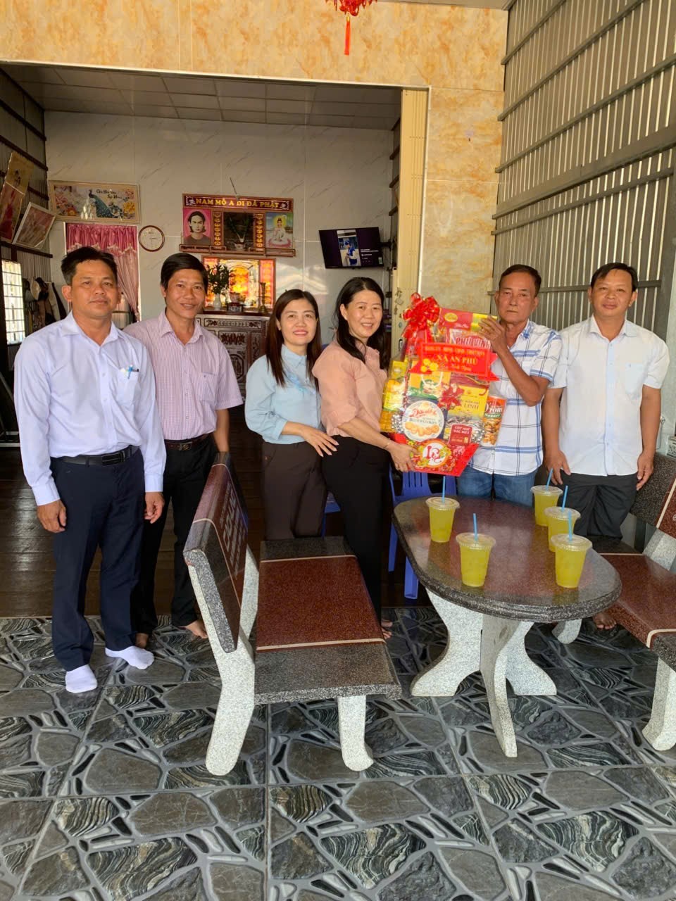 Đoàn công tác tặng quà và chúc tết, chụp ảnh lưu niệm với bà Lê Thị Minh Thủy, nguyên Bí thư, Chủ tịch UBND xã Phước Hưng.