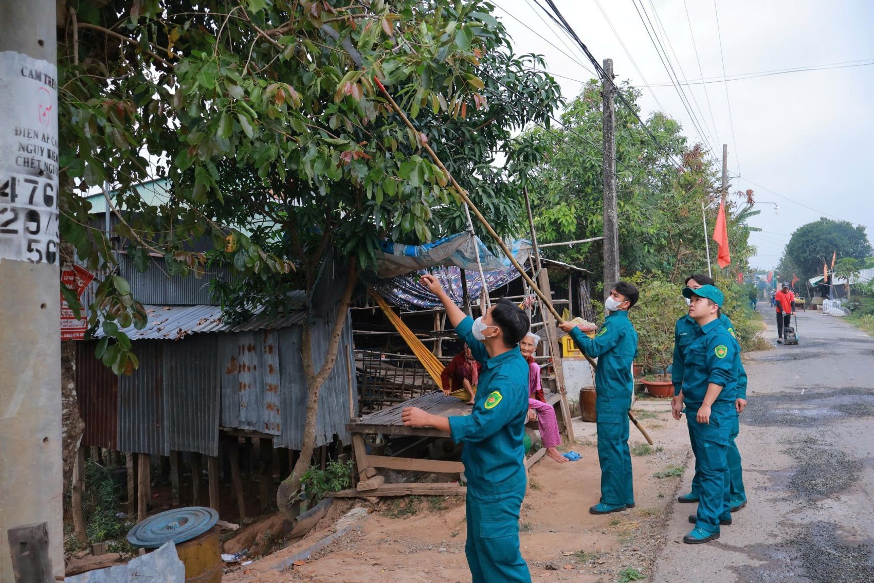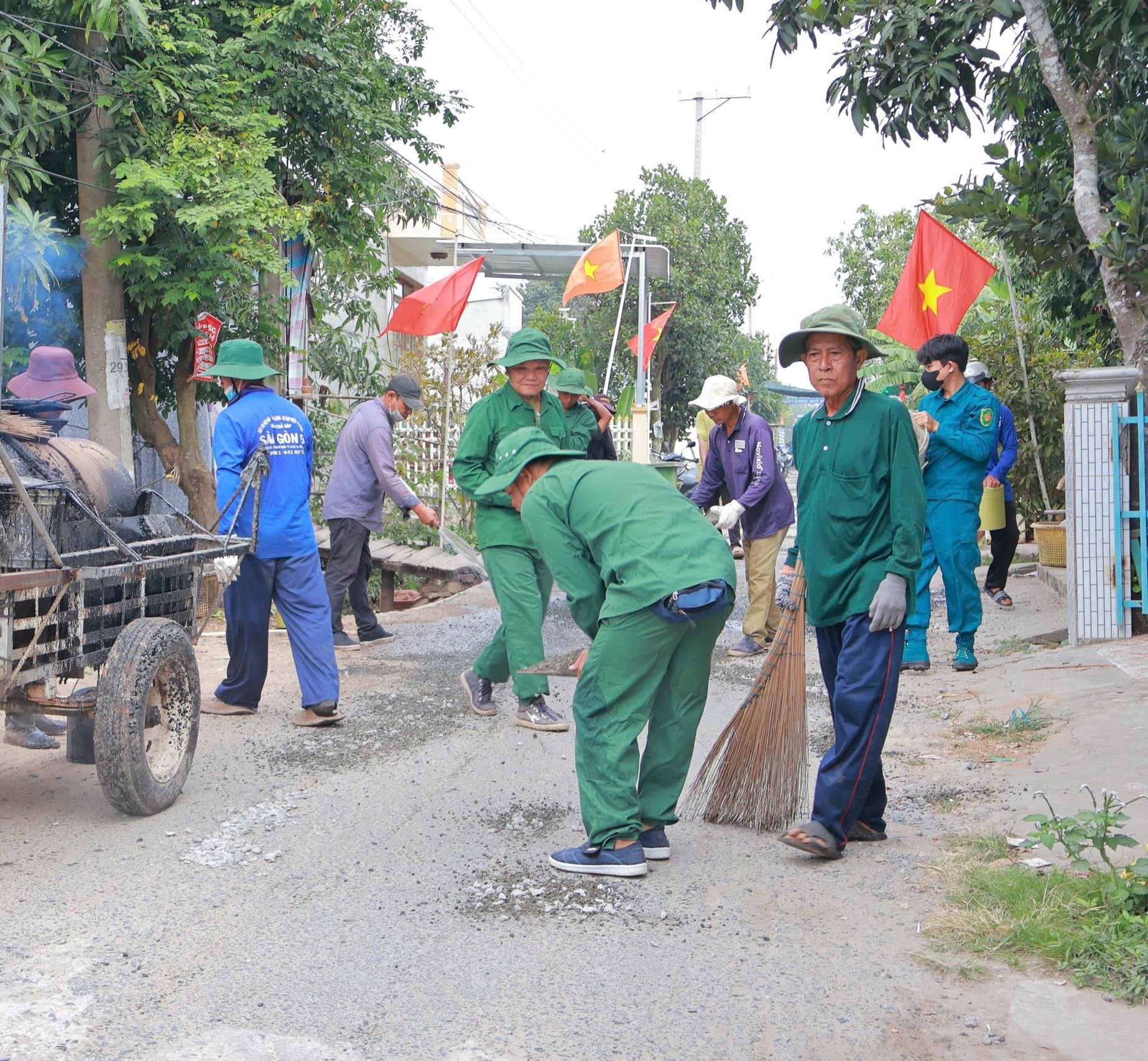 Ban Chỉ huy Quân Sự và Ban Trị sự Phật giáo Hòa Hảo xã An Phú ra quân mé nhánh cây, dặm vá ổ gà đường nông thôn