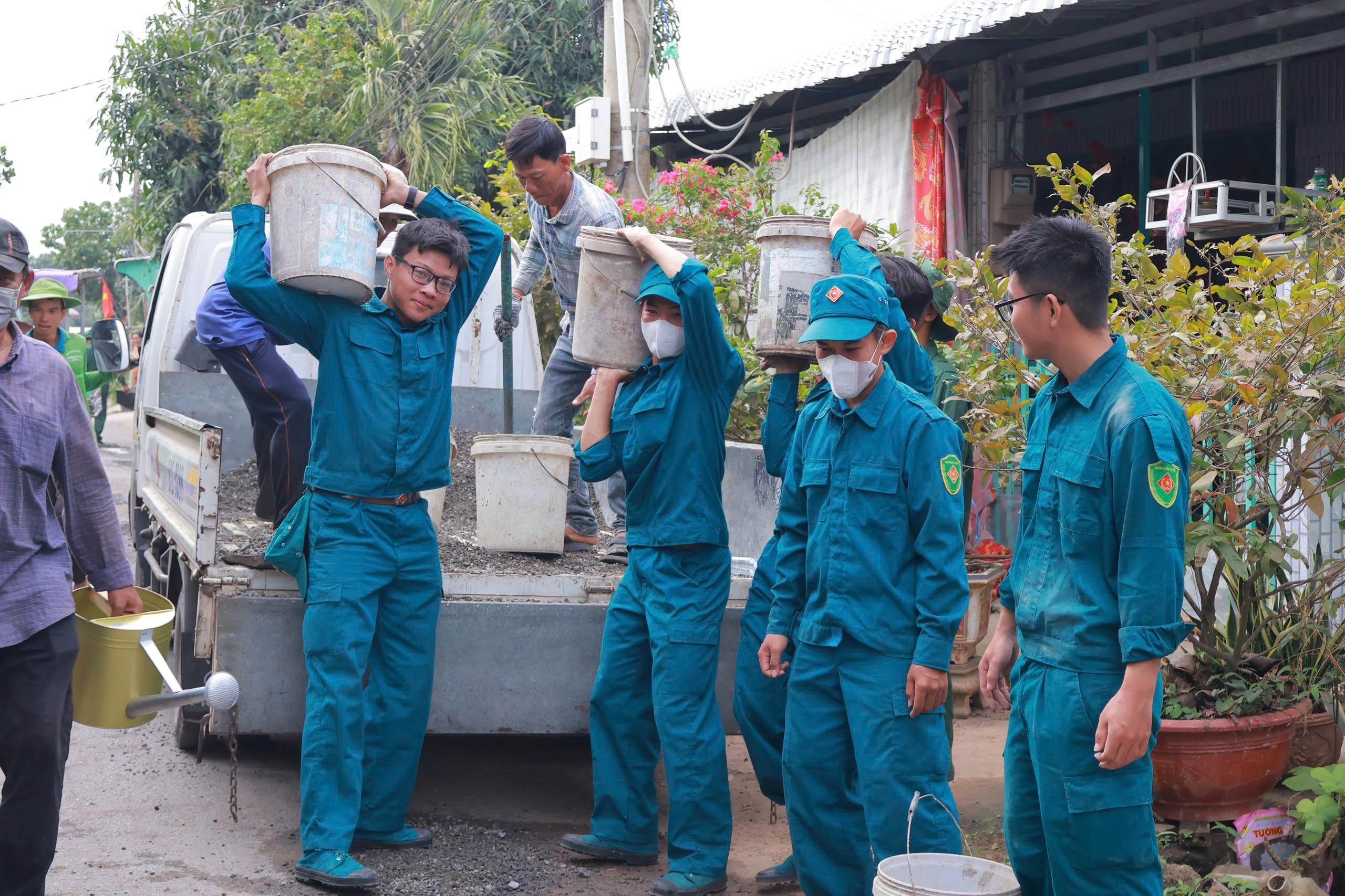 Lực lượng dân quân Ban Chỉ huy Quân sự xã cùng Ban trị sự PGHH xã An Phú vá đường, ổ gà trên lộ nông thôn