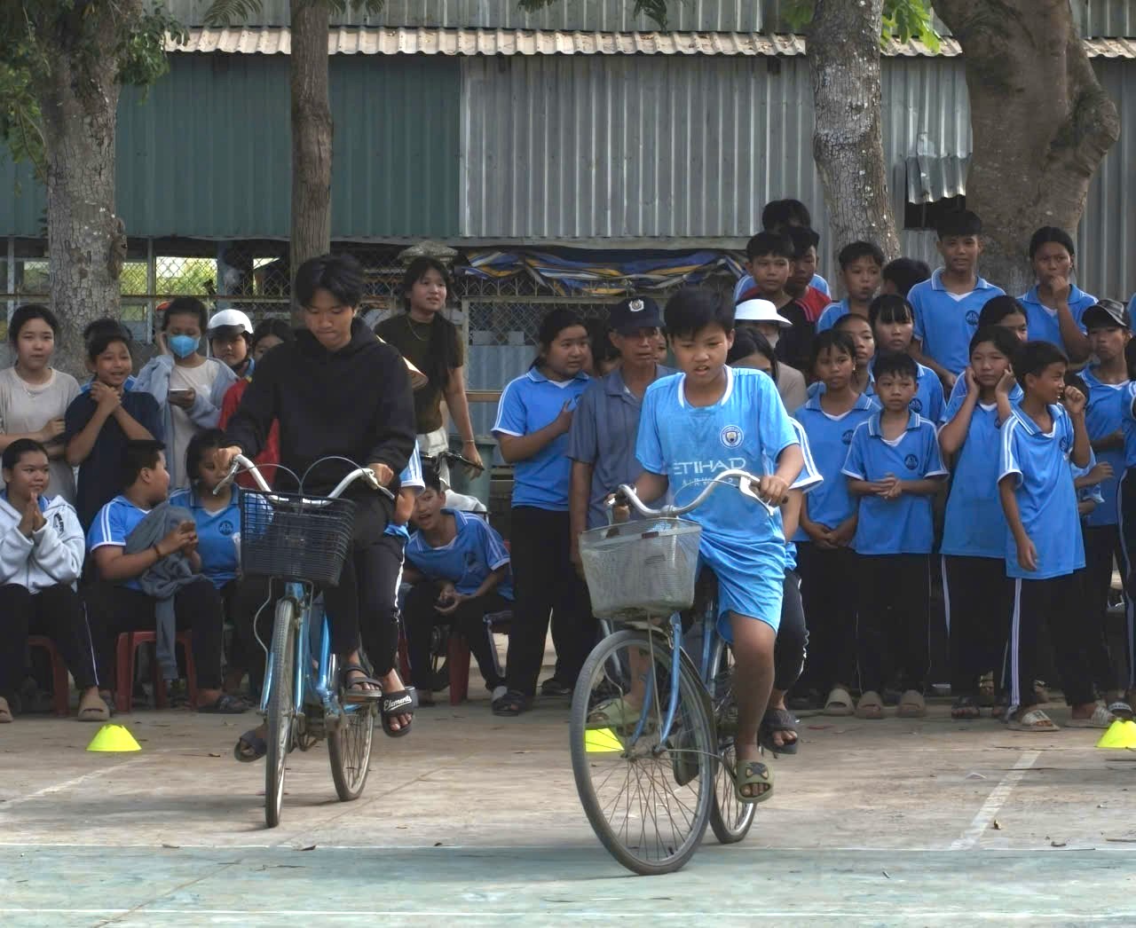 Các em học sinh tham gia trò chơi đi xe đạp chậm