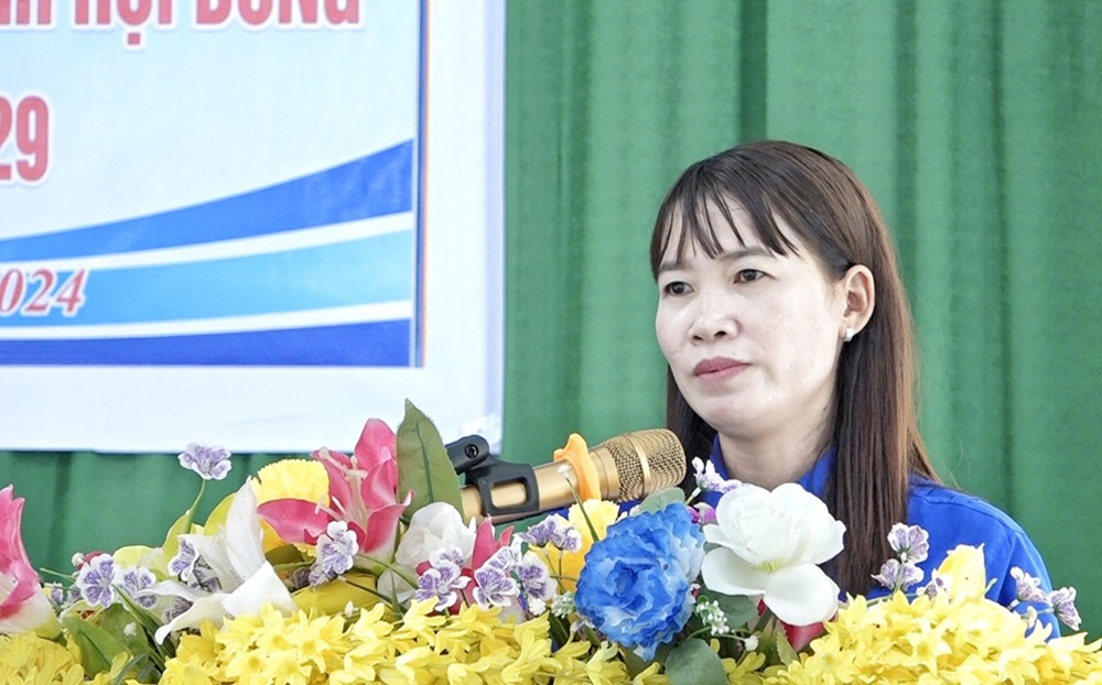 Chị Lâm Thị Ngọc Giàu, Bí thư Đoàn Thanh niên Cộng sản Hồ Chí Minh huyện, Chủ tịch Hội Liên hiệp Thanh niên Việt Nam huyện phát biểu tại đại hội