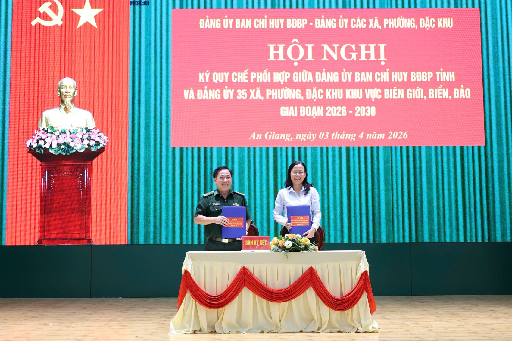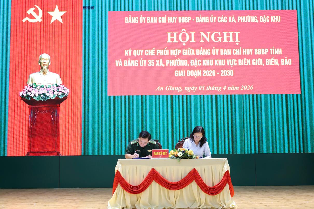 Chiều 03/4, Đảng ủy Ban Chỉ huy Bộ đội Biên phòng tỉnh An Giang tổ chức Hội nghị ký quy chế phối hợp với Đảng ủy 35 xã, phường, đặc khu khu vực biên giới, biển, đảo trong lãnh đạo, chỉ đạo công tác biên phòng và xây dựng Bộ đội Biên phòng tỉnh giai đoạn 2026 - 2030.