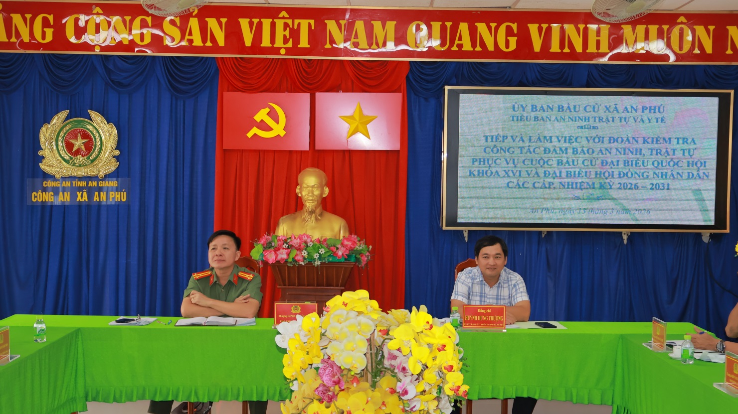 Sáng 13/03, Đoàn kiểm tra bảo đảm an ninh, trật tự và y tế tỉnh An Giang do Thượng tá Phan Quốc Dũng, Phó trưởng Phòng PX03 làm trưởng đoàn, đến kiểm tra tình hình bảo đảm an ninh trật tự và y tế trong cuộc bầu cử Đại biểu Quốc hội khoá XVI và Đại biểu HĐND các cấp nhiệm kỳ 2026 -2031; tiếp đoàn có ông Huỳnh Hưng Thượng, Phó Chủ tịch UBND xã An Phú.