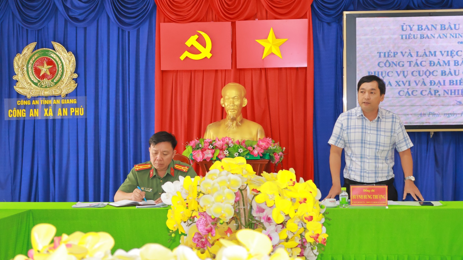 Phát biểu tại buổi làm việc, ông Huỳnh Hưng Thượng, Phó Chủ tịch UBND xã An Phú ghi nhận và đánh giá cao sự chủ động của Công an xã An Phú trong việc tham mưu cấp ủy, chính quyền địa phương triển khai các biện pháp bảo đảm an ninh trật tự phục vụ bầu cử. Công tác nắm tình hình, quản lý địa bàn, bố trí lực lượng và xây dựng phương án bảo vệ tại các khu vực bỏ phiếu được chuẩn bị nghiêm túc, cơ bản đáp ứng yêu cầu nhiệm vụ, đồng thời, khẳng định địa phương sẽ tiếp tục phát huy tinh thần trách nhiệm, tăng cường tuyên truyền, vận động Nhân dân tích cực tham gia bầu cử, góp phần bảo đảm an ninh, an toàn tuyệt đối trước, trong và sau ngày bầu cử.