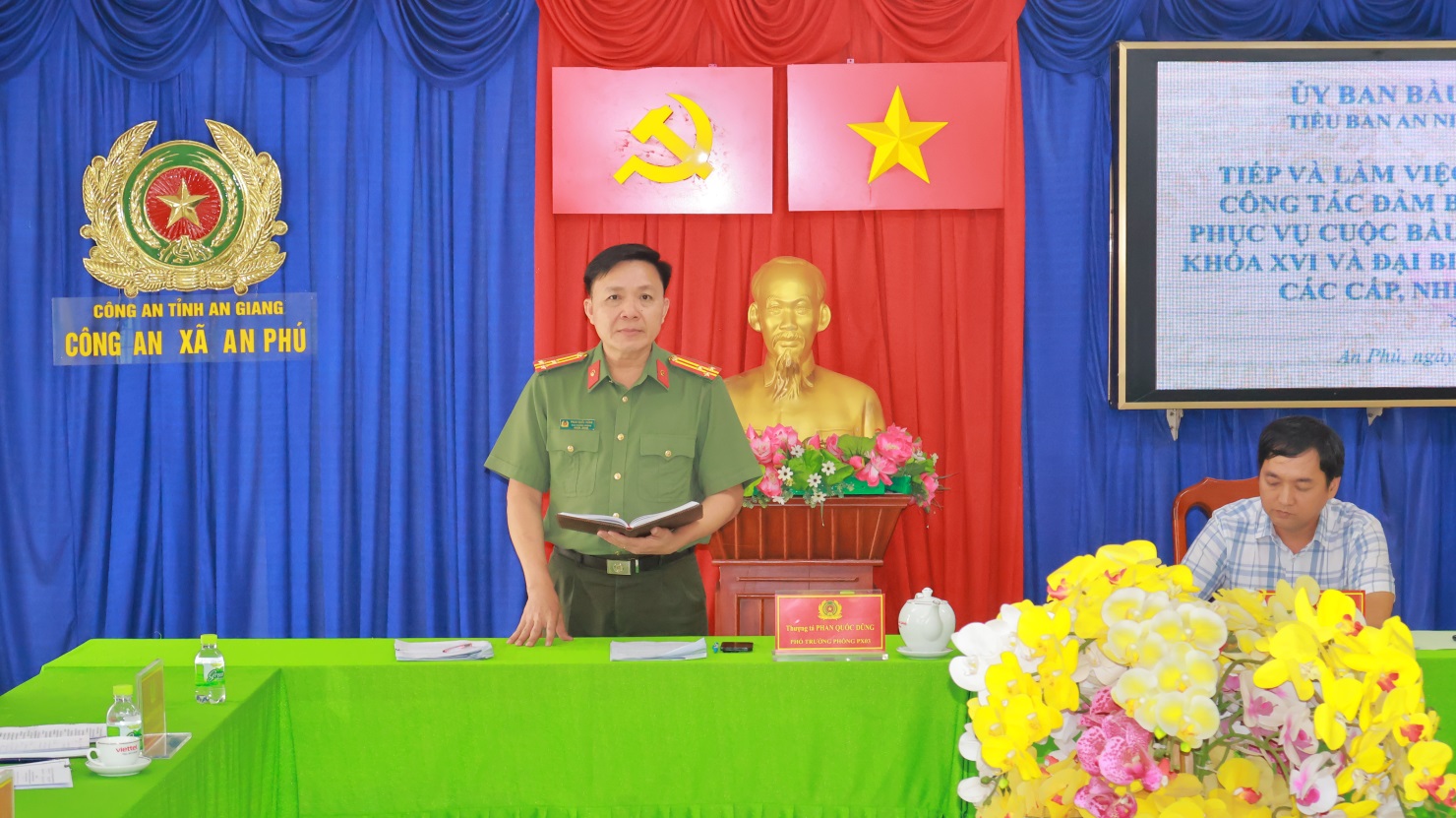 Thượng tá Phan Quốc Dũng đề nghị UBND xã An Phú tiếp tục duy trì lực lượng trực 24/24 giờ tại các tổ bầu cử, tăng cường công tác phòng ngừa tội phạm, tệ nạn xã hội và chủ động xử lý kịp thời các tình huống phát sinh. Công an tỉnh sẽ tăng cường lực lượng hỗ trợ địa phương trong 2 ngày diễn ra bầu cử, góp phần bảo đảm an ninh, an toàn tuyệt đối cho ngày bầu cử.