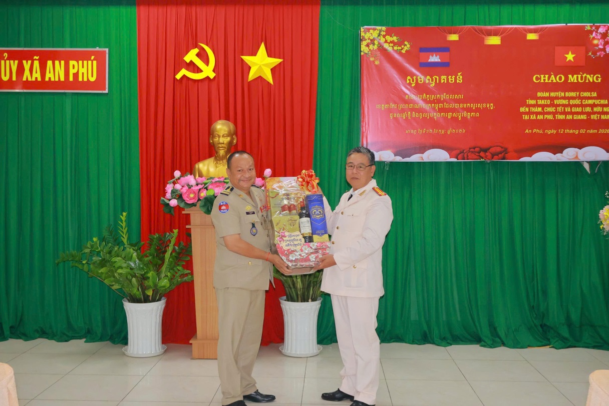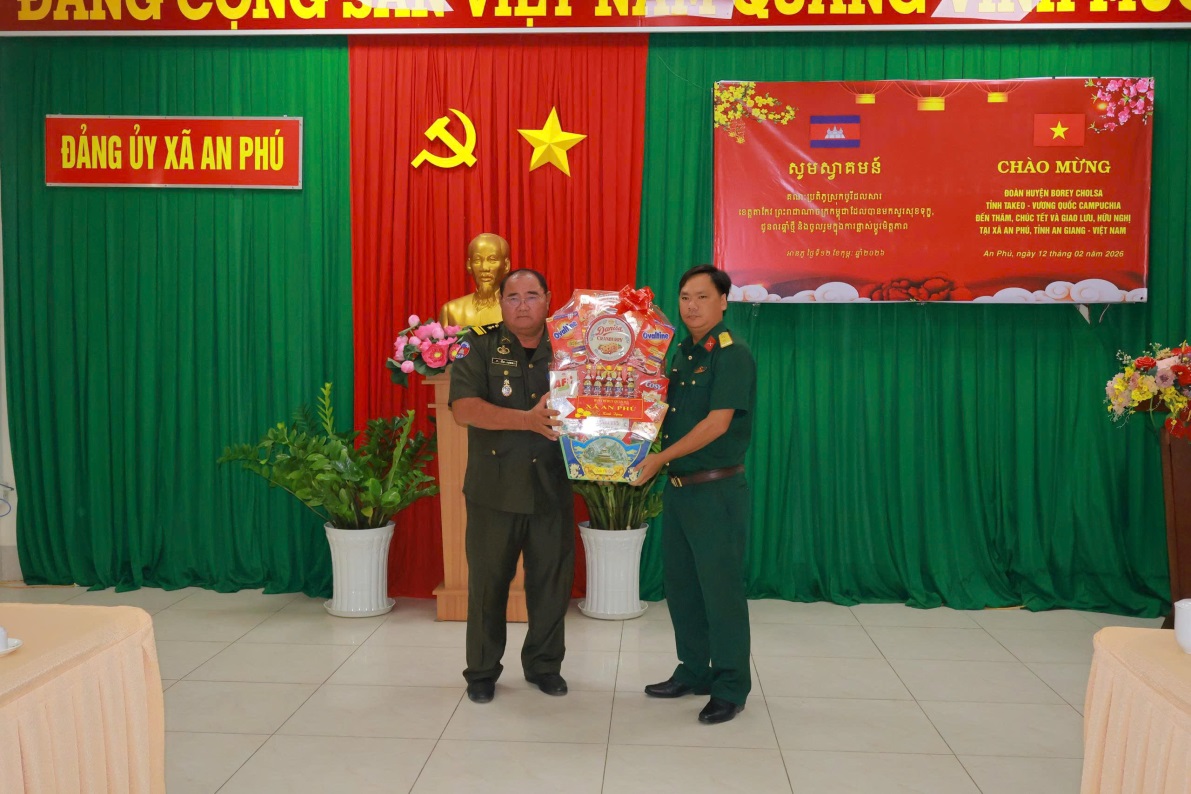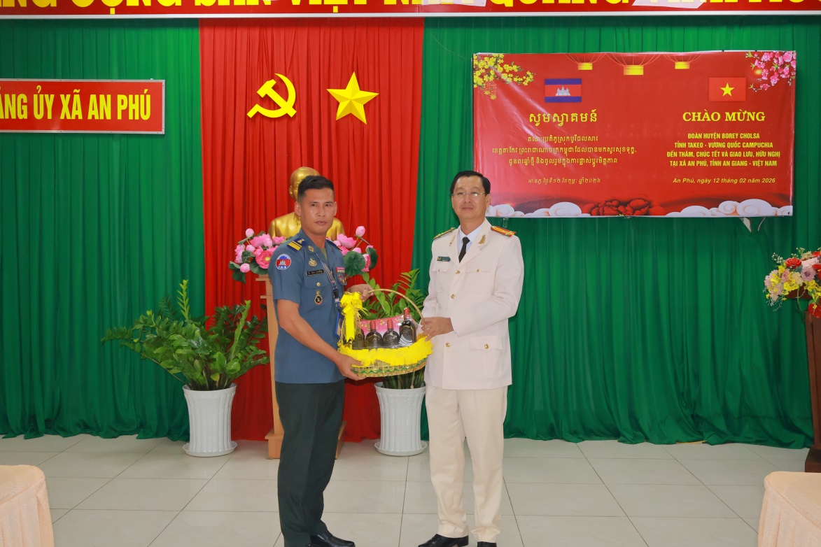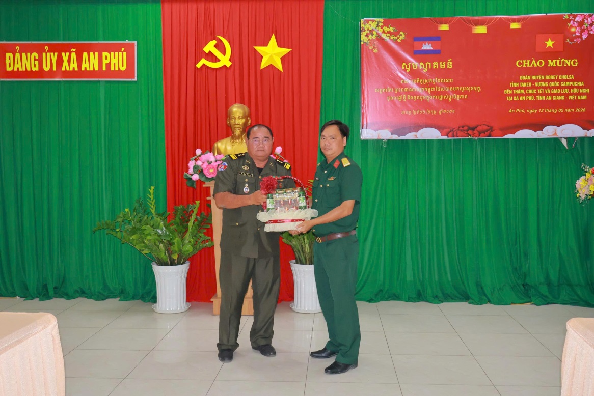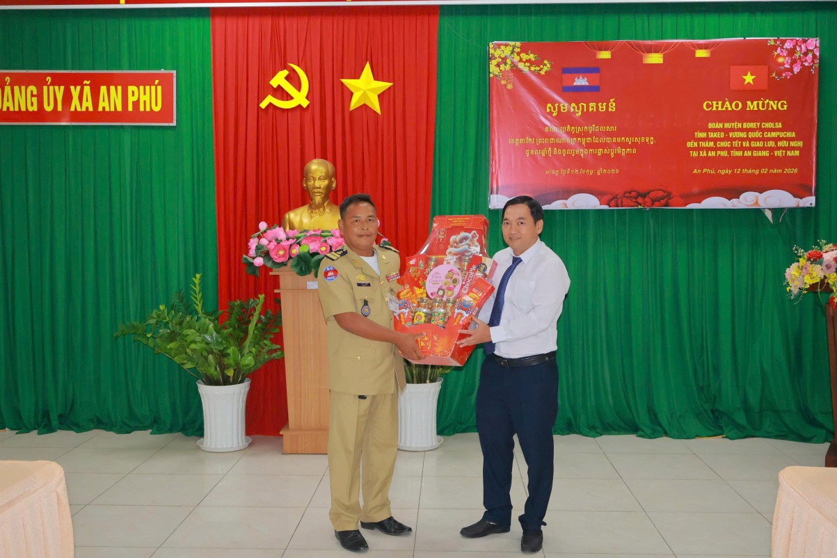Thay mặt đoàn công tác, ông Siv Raksa, Phó Huyện trưởng huyện Borey Cholsa cảm ơn sự đón tiếp nồng hậu, chu đáo của lãnh đạo xã An Phú. Nhân dịp Tết cổ truyền của dân tộc Việt Nam, ông Siv Raksa chúc lãnh đạo, lực lượng vũ trang và Nhân dân xã An Phú đón xuân mới dồi dào sức khỏe, hạnh phúc và đạt nhiều thành công.