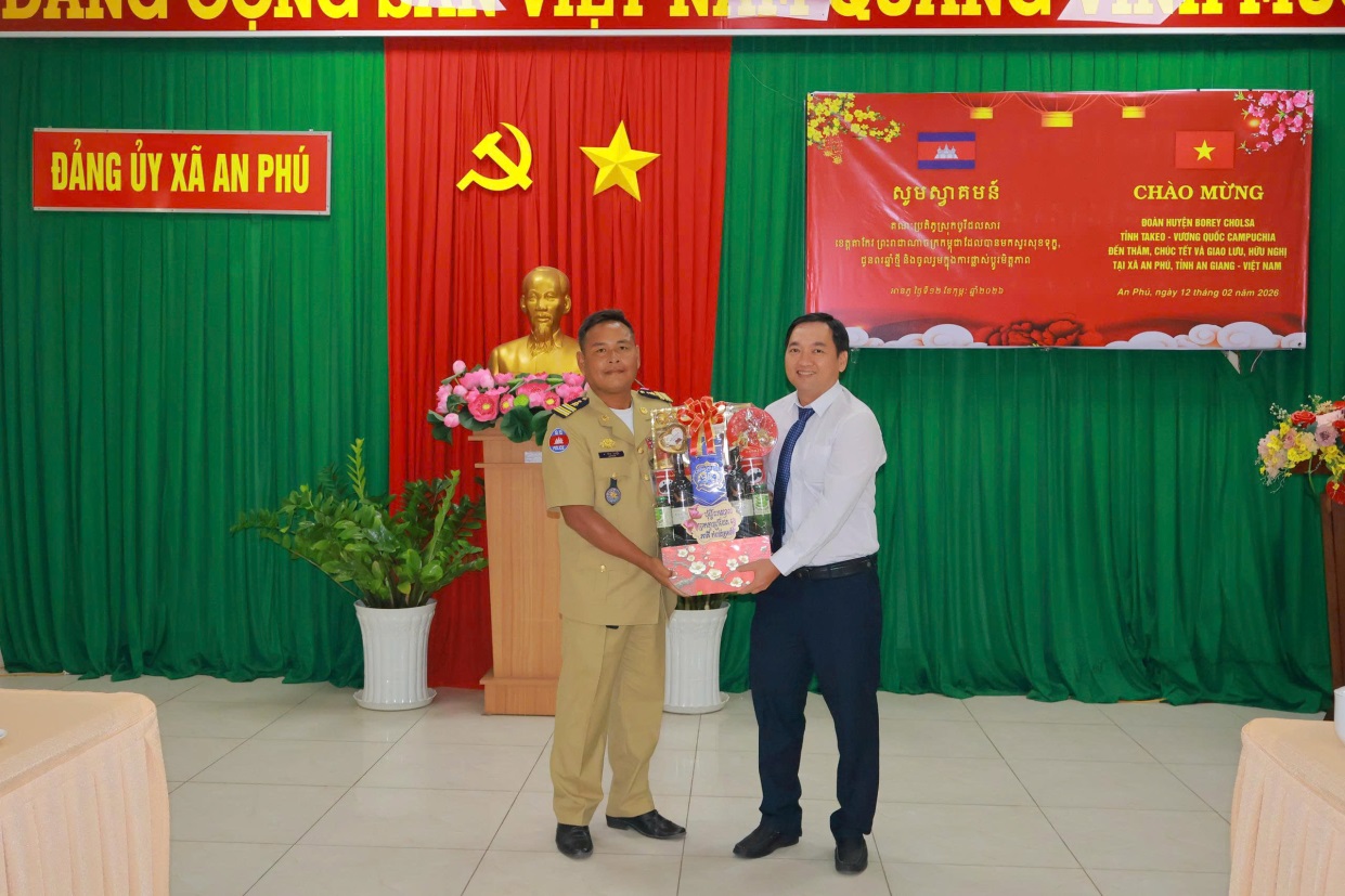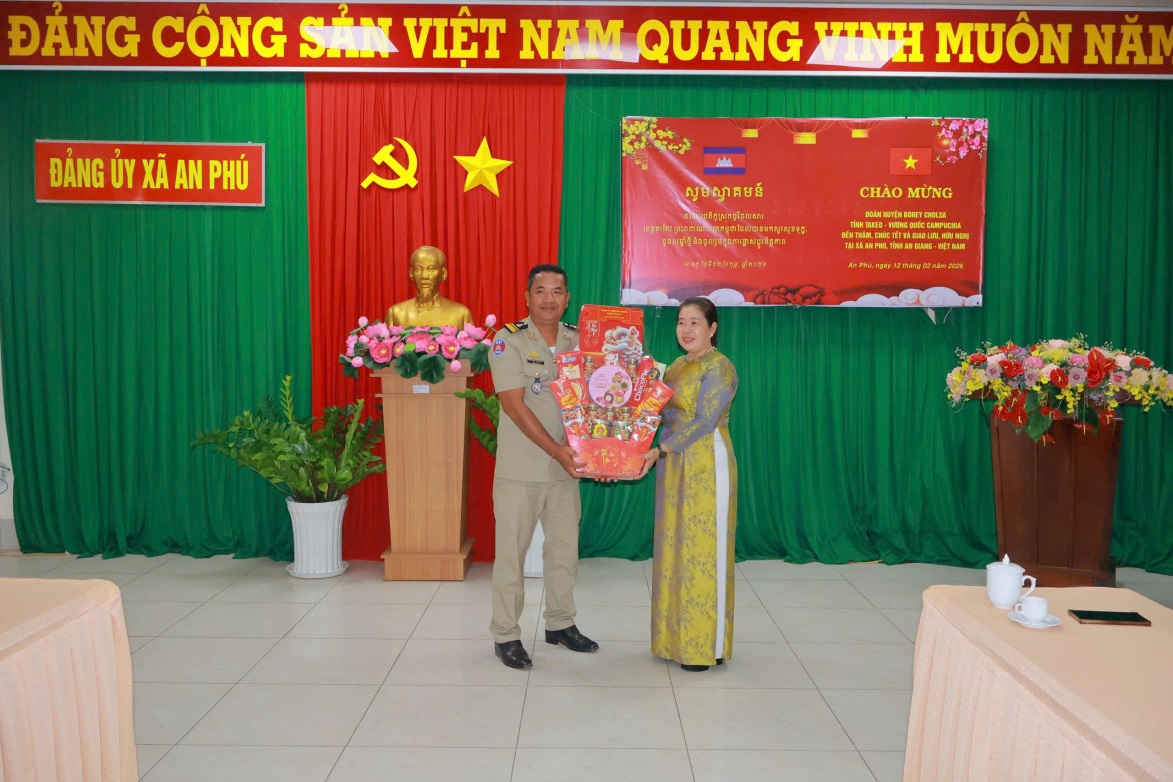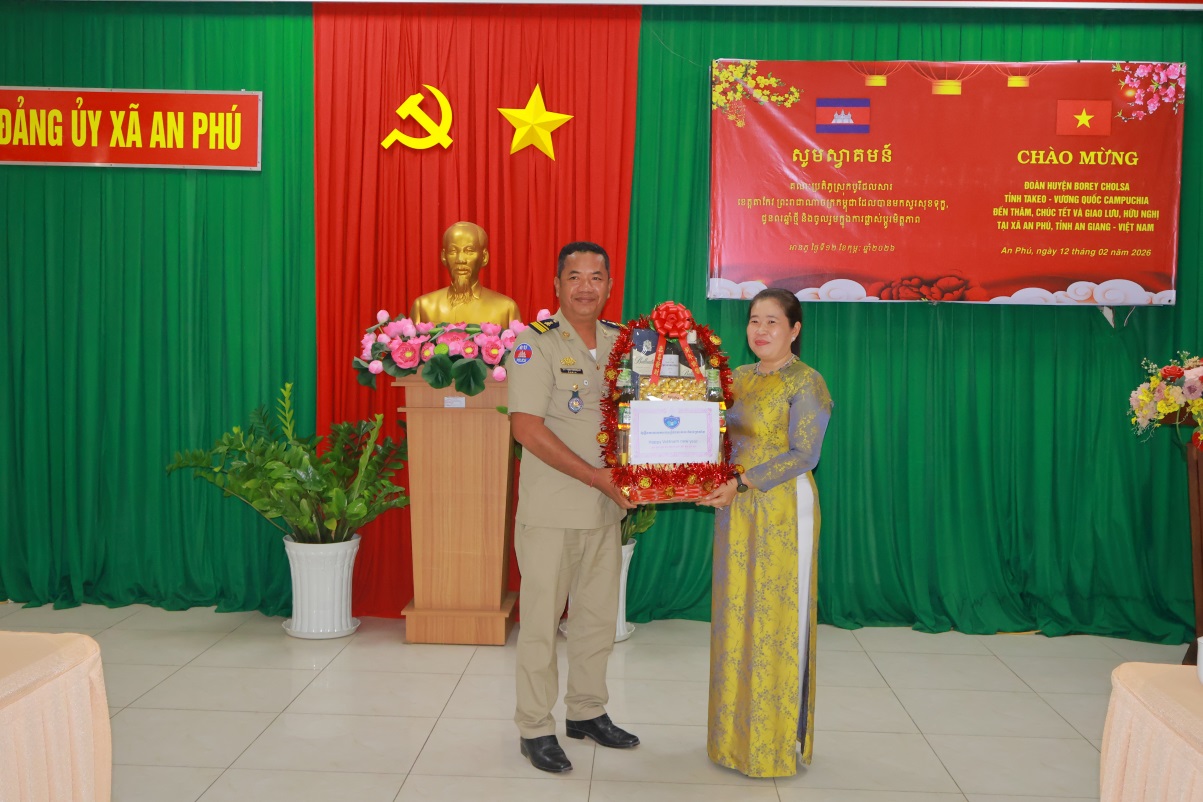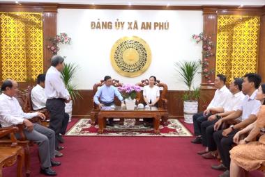 Chiều 12/2, đoàn công tác huyện Borey Cholsa, tỉnh Takeo, Vương quốc Campuchia do ông Siv Raksa, Phó Huyện trưởng huyện Borey Cholsa làm trưởng đoàn đến thăm, chúc tết xã An Phú; tiếp đoàn có bà Quách Tố Giang, Tỉnh ủy viên, Bí thư Đảng ủy, Chủ tịch HĐND xã; ông Lê Thanh Phương, Phó Bí thư Thường trực Đảng ủy, Giám đốc Trung tâm Chính trị xã; ông Nguyễn Xuân Tiến, Phó Bí thư Đảng ủy, Chủ tịch UBND xã.