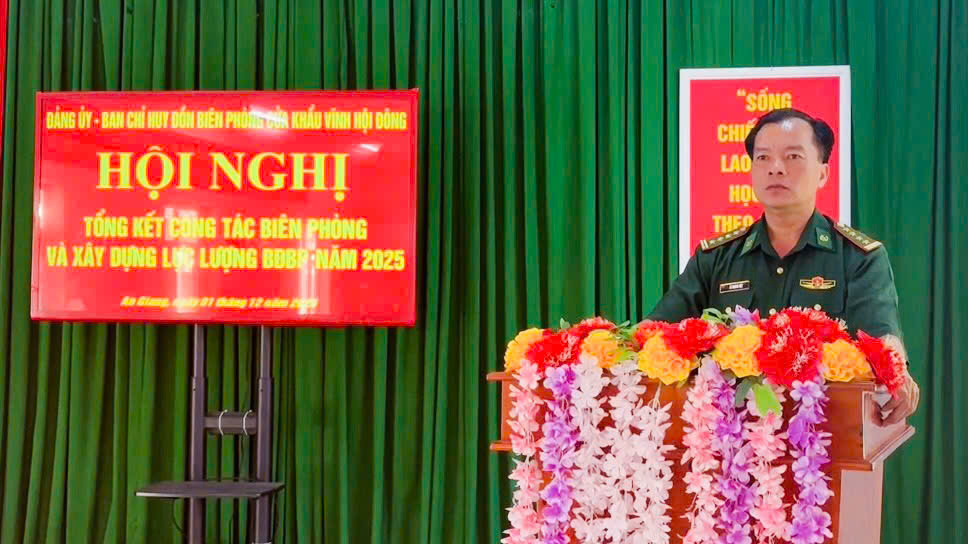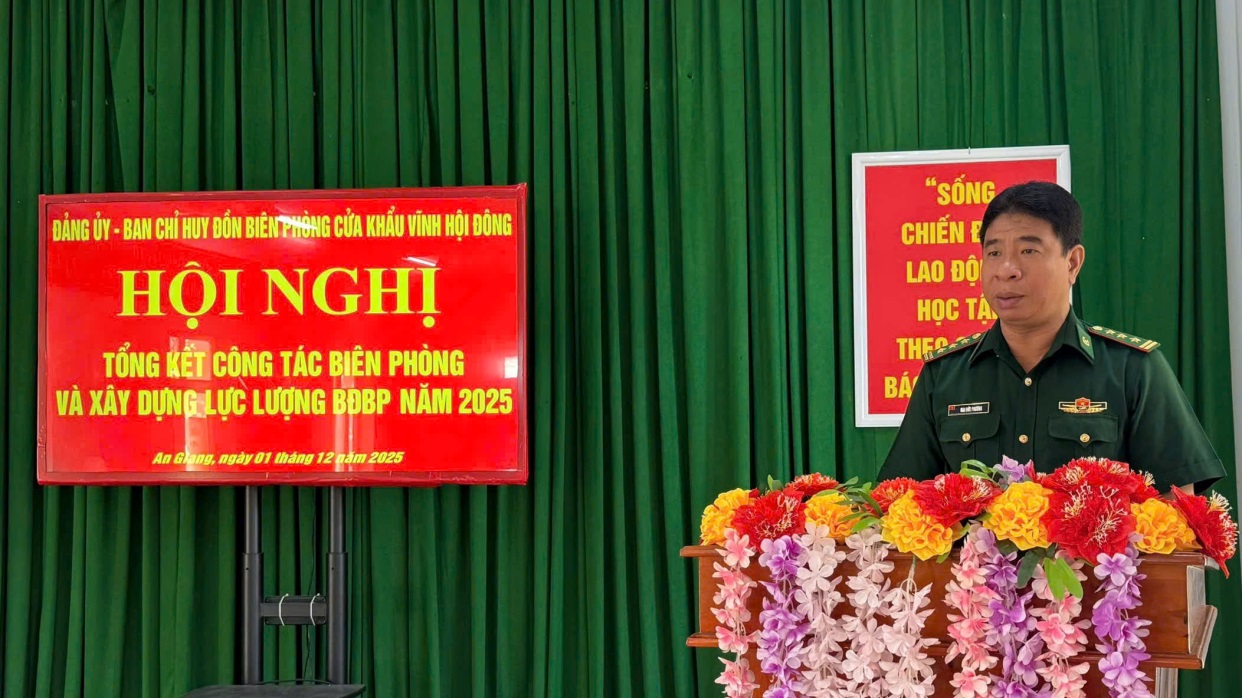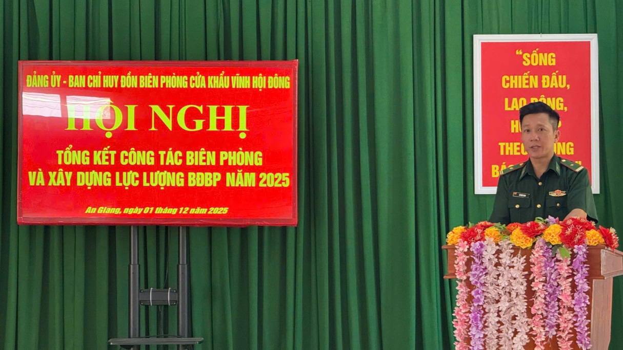Ngày 1/12, Đồn Biên phòng cửa khẩu Vĩnh Hội Đông tổ chức Hội nghị tổng kết công tác biên phòng và xây dựng lực lượng Bộ đội Biên phòng năm 2025; Đại tá Lê Hoàng Việt, Phó Chính ủy Ban Chỉ huy Bộ đội Biên phòng tỉnh An Giang đến dự.
