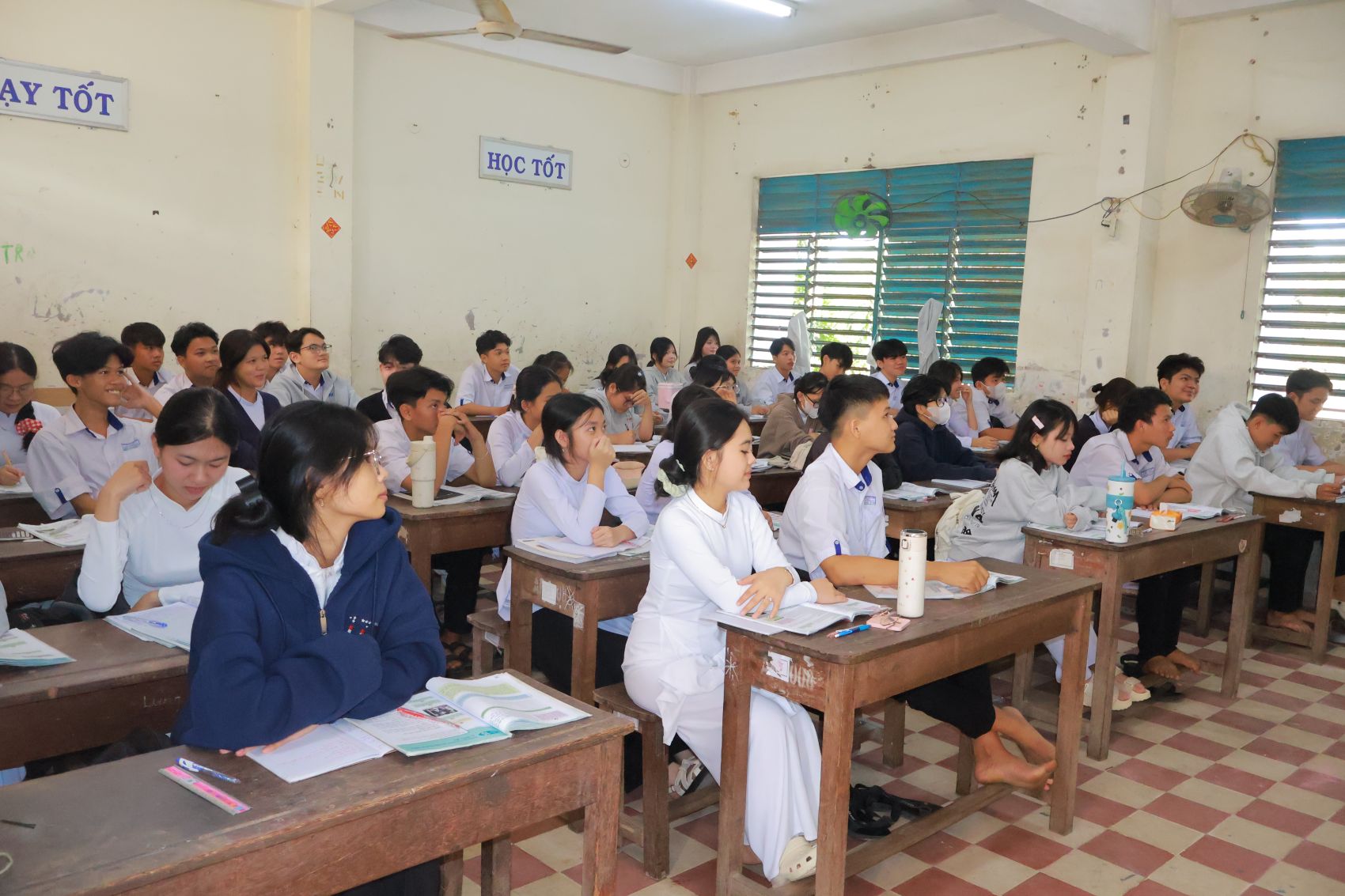 Các em học sinh trường THPT An Phú chăm chú lắng nghe giáo viên giảng bài