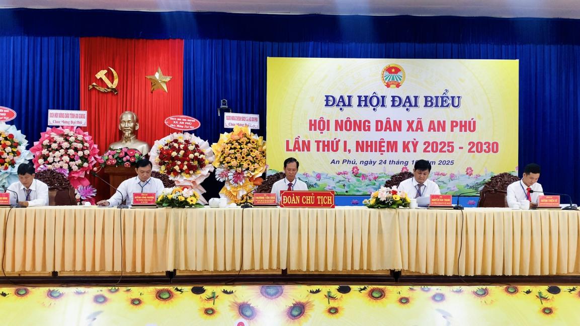 Sáng 24/10, Hội Nông dân xã An Phú tổ chức thành công Đại hội đại biểu lần thứ I, nhiệm kỳ 2025 – 2030; tham dự có ông Phan Tùng Lâm, Phó Chủ tịch Hội Nông dân tỉnh An Giang; bà Quách Tố Giang, Tỉnh ủy viên, Bí thư Đảng ủy, Chủ tịch HĐND xã An Phú; ông Lê Thanh Phương, Phó Bí thư Thường trực Đảng ủy, Giám đốc Trung tâm Chính trị xã; ông Nguyễn Xuân Tiến, Phó Bí thư Đảng ủy, Chủ tịch UBND xã; các đồng chí Ủy viên Ban Thường vụ Đảng ủy xã, cùng 83 đại biểu tiêu biểu đại diện 1.107 hội viên nông dân trong toàn xã về dự.