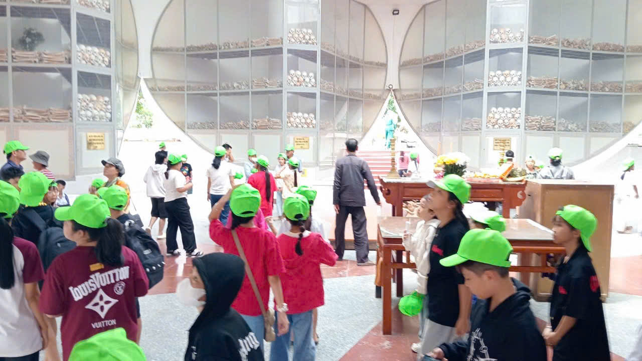 Các em học sinh tham quan Nhà mồ Ba Chúc