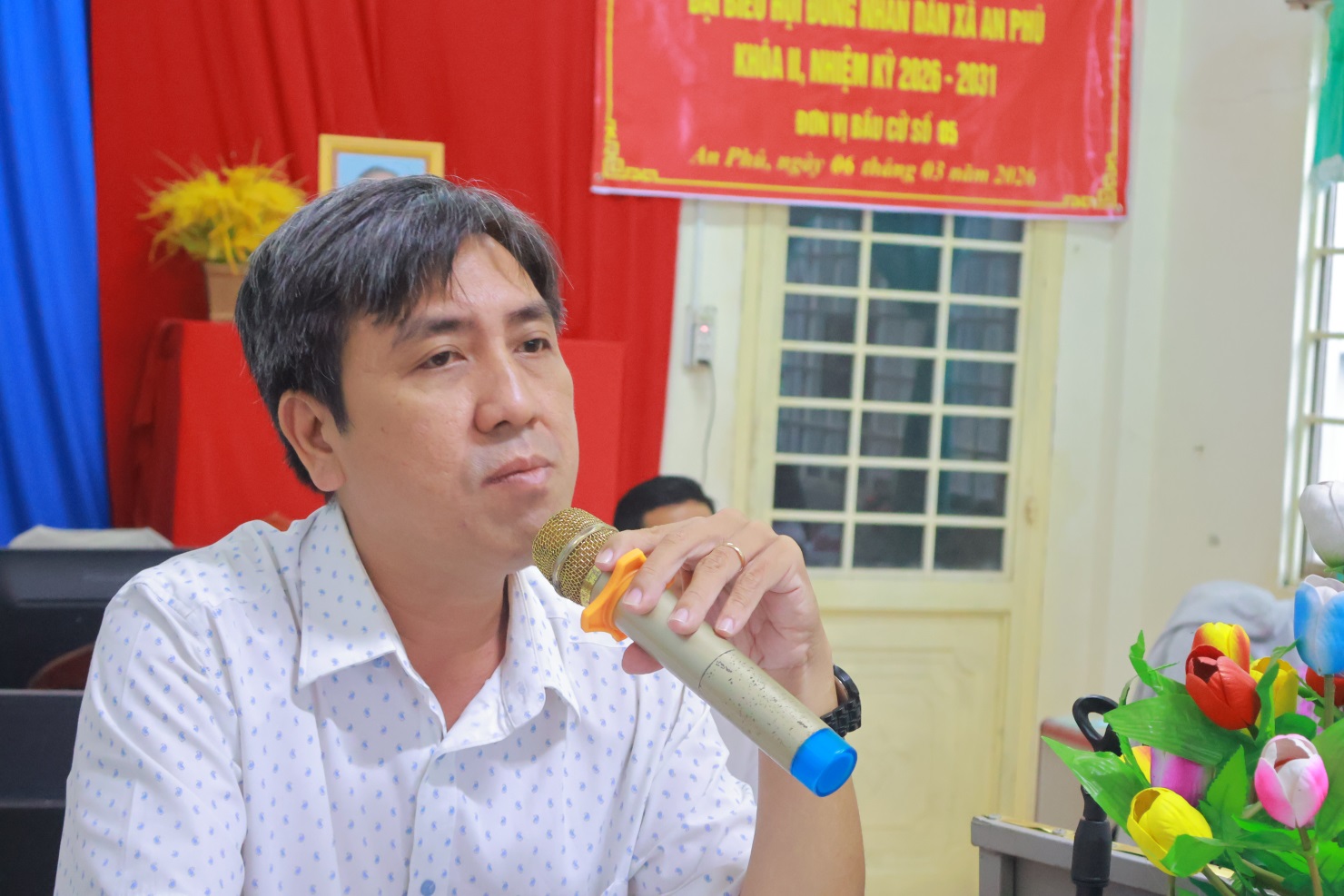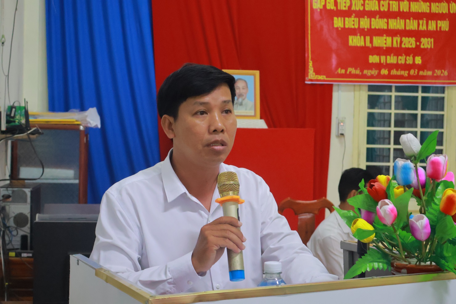 Ông Nguyễn Xuân Tiến, Phó Bí thư Đảng ủy, Chủ tịch UBND xã An Phú, đại diện ứng cử viên HĐND phát biểu tại buổi tiếp xúc cử tri, tổ bầu cử số 5