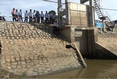 Phó Chủ tịch UBND huyện An Phú kiểm tra các cống dưới đê bao và tình hình thu hoạch vụ Hè Thu năm 2024
