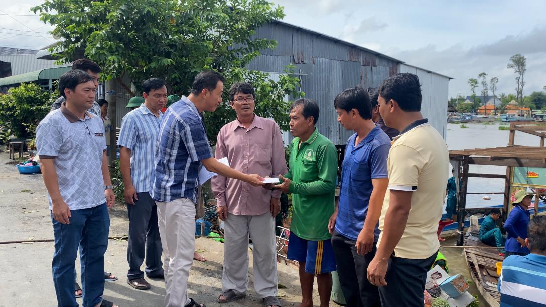 Phó Bí thư Thường trực Đảng ủy xã An Phú Lê Thanh Phương trao tiền hỗ trợ các gia đình