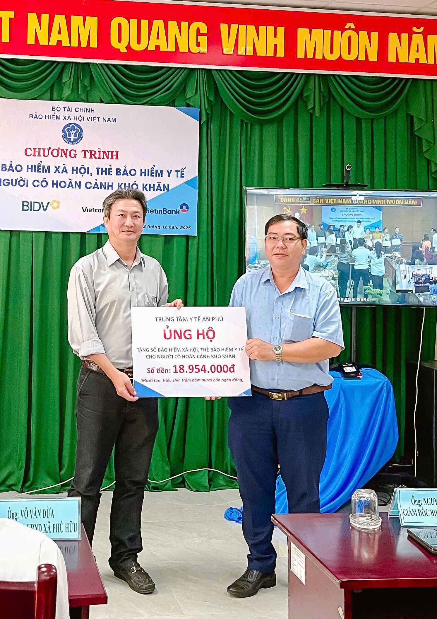 Đại diện Trung tâm Y tế An Phú trao Bảng tượng trưng số tiền ủng hộ tặng sổ BHXH, thẻ BHYT cho người có hoàn cảnh khó khăn