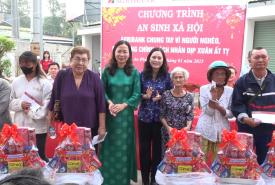 Bà Đặng Thị Hoa Rây, Chủ tịch UBMTTQVN tỉnh An Giang trao quà tết gia đình chính sách, hộ nghèo huyện An Phú