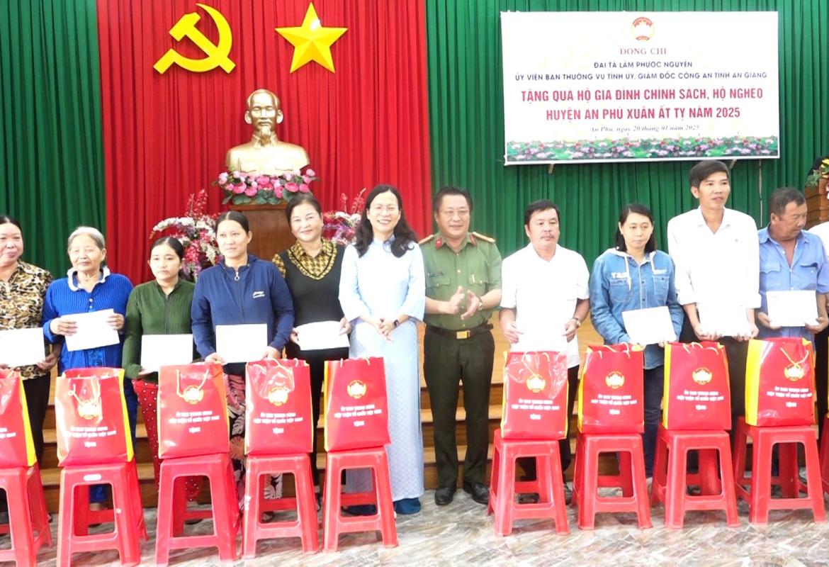 Đại tá Lâm Phước Nguyên, Giám đốc Công an tỉnh An Giang trao 78 phần quà tết cho gia đình chính sách khó khăn, hộ nghèo huyện An Phú