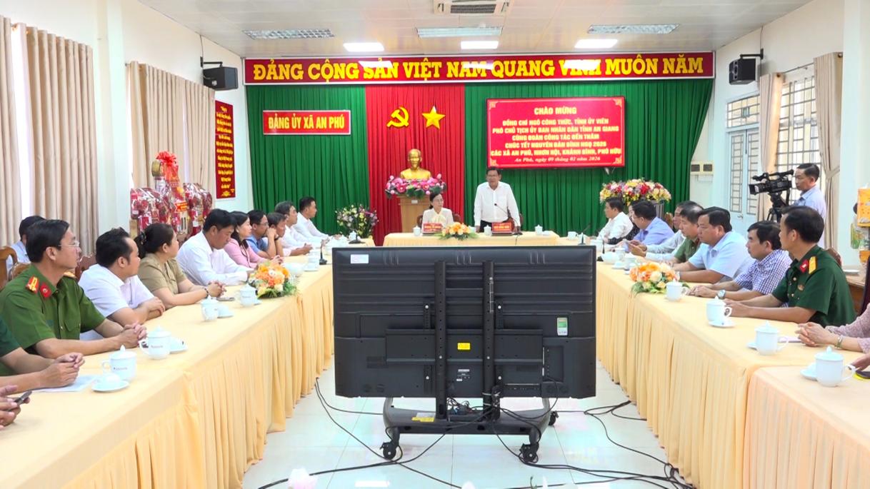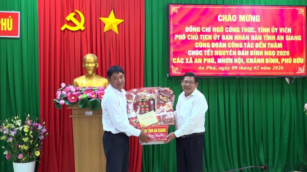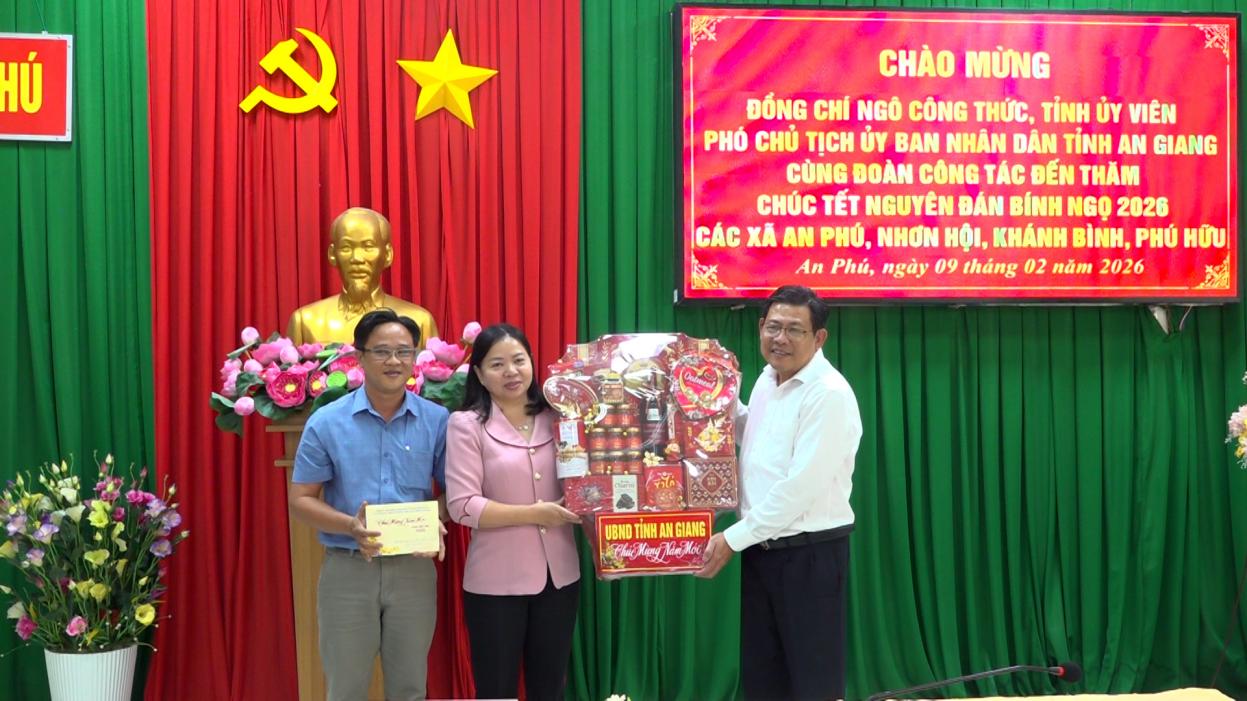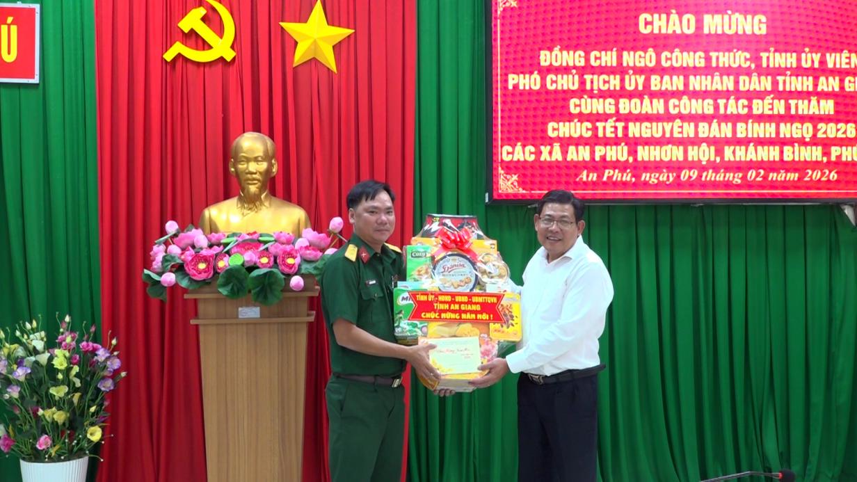 Thay mặt đoàn công tác, Phó Chủ tịch UBND tỉnh An Giang Ngô Công Thức tặng quà, chúc Đảng ủy, HĐND, UBND, Ủy ban MTTQ Việt Nam, lực lượng vũ trang và Nhân dân các xã An Phú, Khánh Bình, Nhơn Hội và Phú Hữu năm mới nhiều sức khỏe, vui tươi và gặt hái nhiều thắng lợi mới.