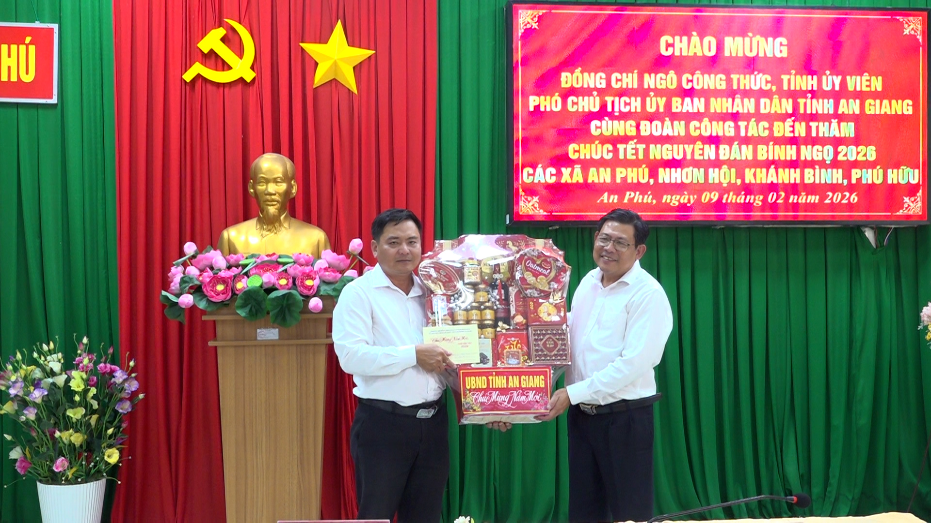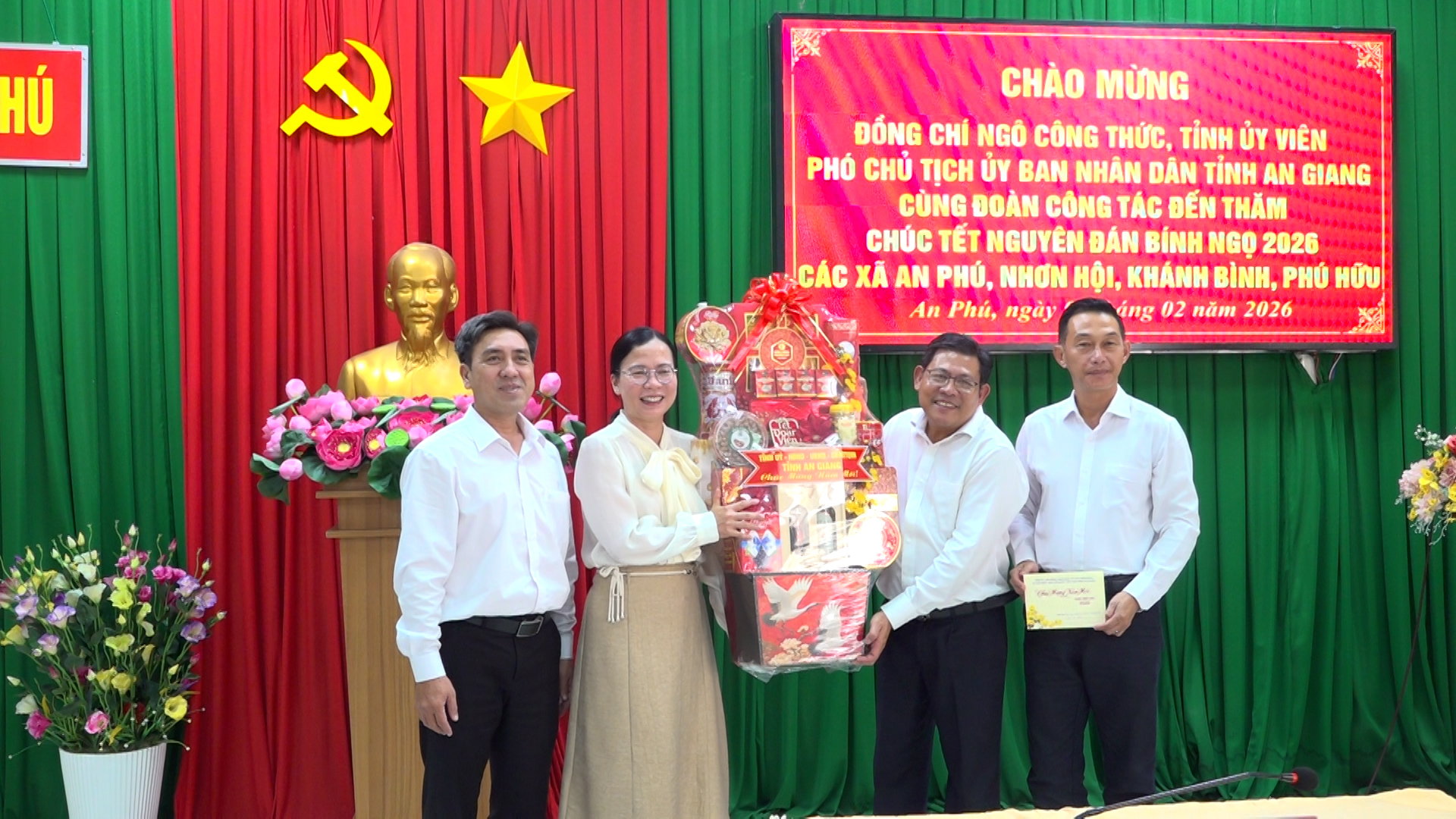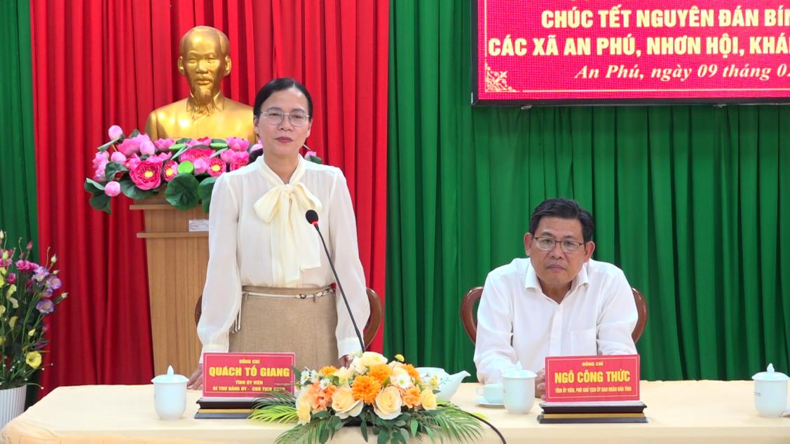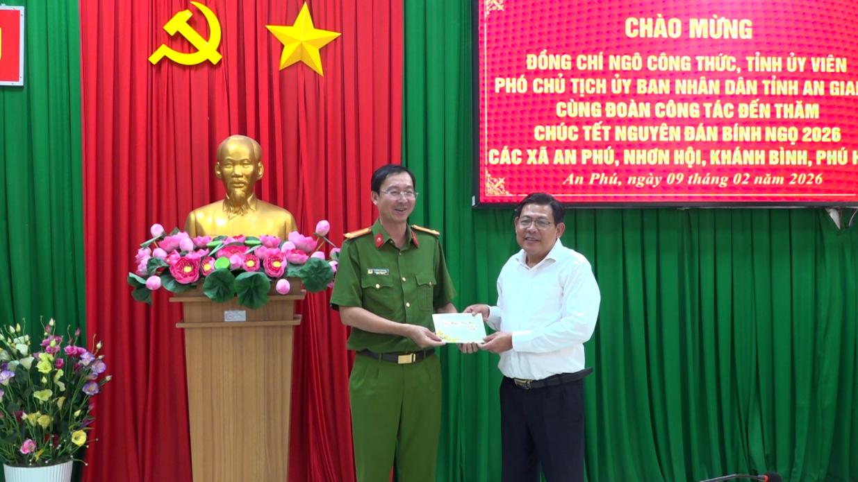 Thay mặt đoàn công tác, Phó Chủ tịch UBND tỉnh An Giang Ngô Công Thức tặng quà, chúc Đảng ủy, HĐND, UBND, Ủy ban MTTQ Việt Nam, lực lượng vũ trang và Nhân dân các xã An Phú, Khánh Bình, Nhơn Hội và Phú Hữu năm mới nhiều sức khỏe, vui tươi và gặt hái nhiều thắng lợi mới.