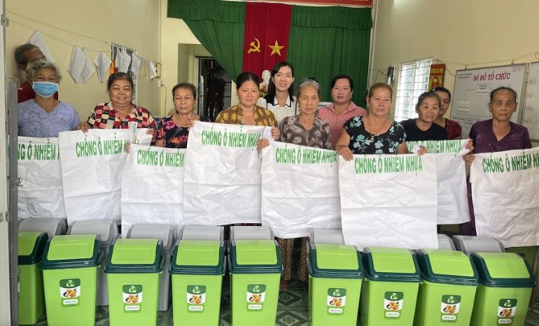 Trao thùng rác môi trường loại 22 lít và bao chống ô nhiễm nhựa cho hộ dân xã Phú Hữu