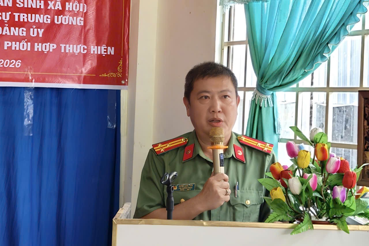Thượng tá Huỳnh Quốc Tiến, Phó trưởng Phòng An ninh nội địa, Công an tỉnh An Giang phát biểu tại buổi lễ