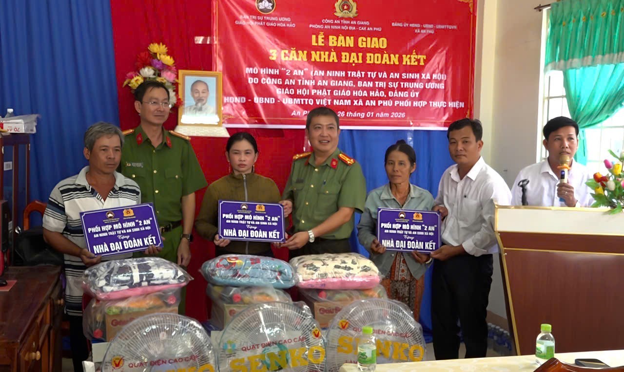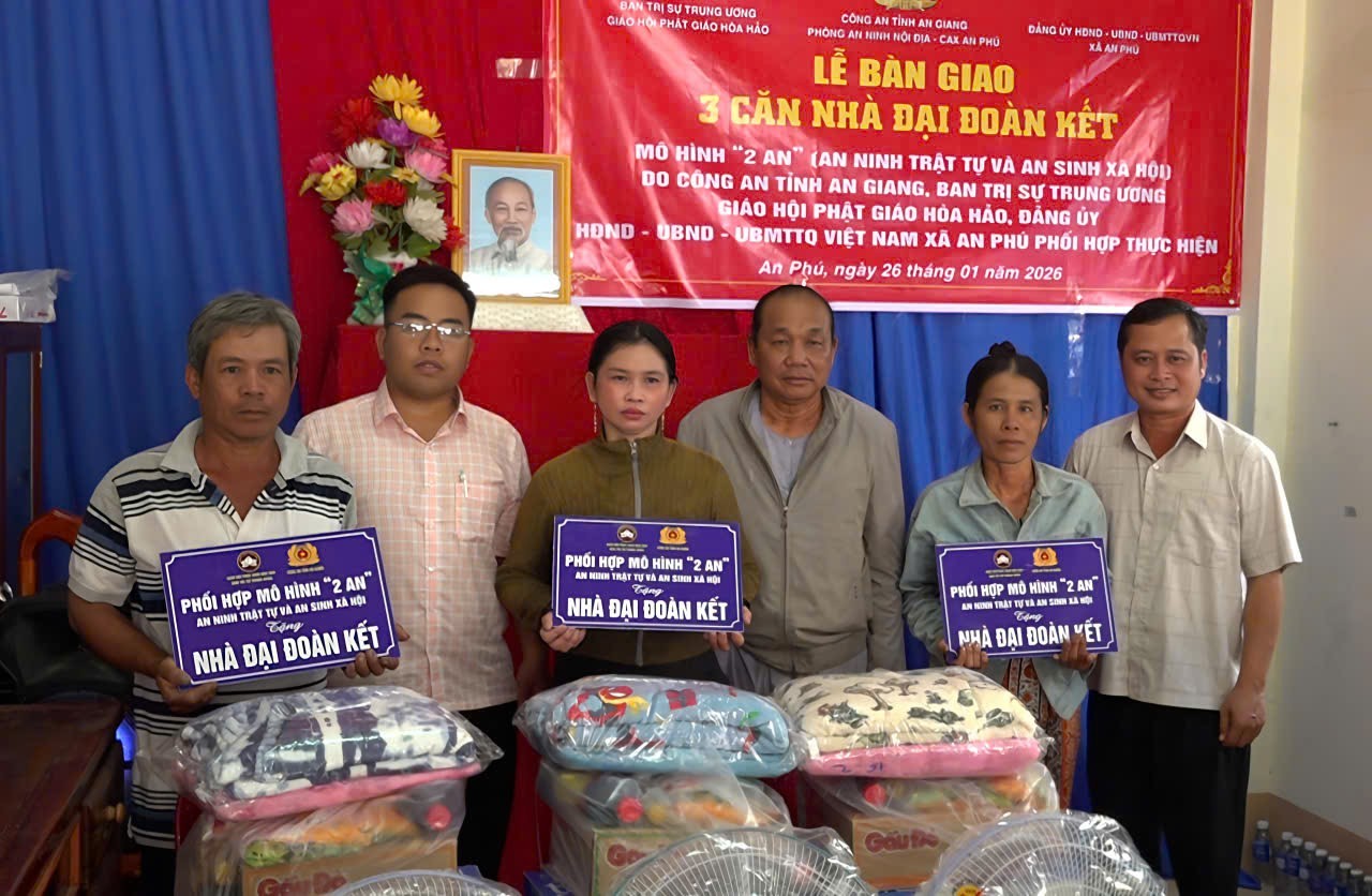 Chiều 26/1, Ban Thường trực Ủy ban Mặt trận Tổ quốc (MTTQ) Việt Nam xã An Phú tổ chức Lễ bàn giao nhà Đại đoàn kết năm 2025 cho các hộ gia đình có hoàn cảnh khó khăn về nhà ở; Thượng tá Huỳnh Quốc Tiến, Phó trưởng Phòng An ninh nội địa, Công an tỉnh An Giang; ông Võ Văn Lẫy, Chủ tịch Ủy ban MTTQ Việt Nam xã; Thượng tá Huỳnh Văn Phú, Trưởng Công an xã đến dự.