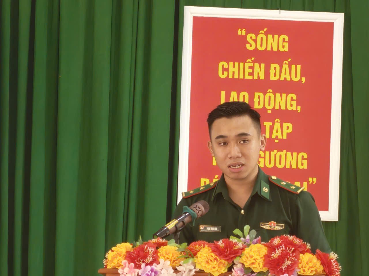 Trung úy Phạm Thiện Hào, Đội trưởng Đội Vận động quần chúng, tuyên truyền về kỷ niệm 67 năm Ngày Truyền thống Bộ đội Biên phòng và 37 năm Ngày Biên phòng toàn tại chương trình