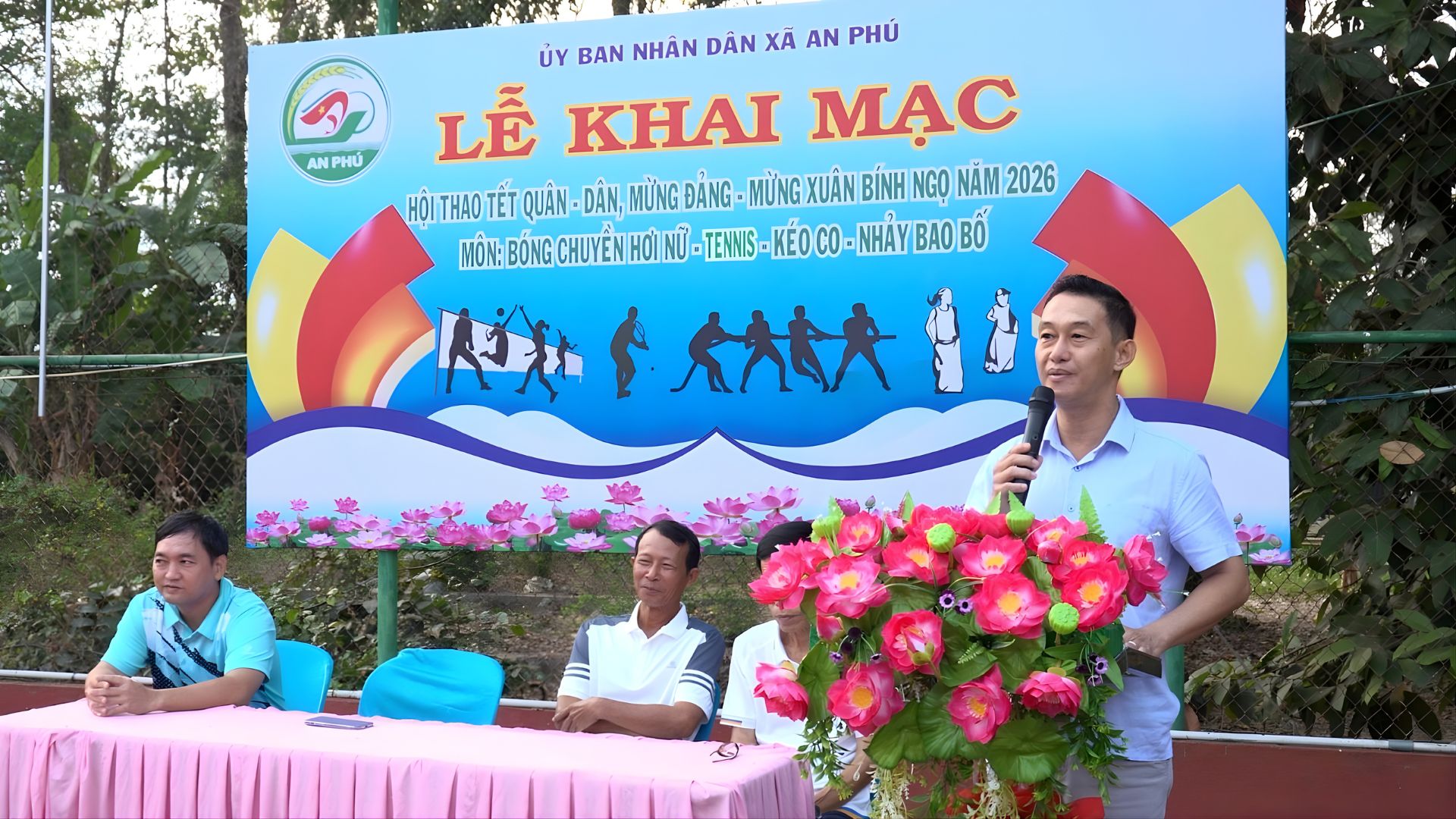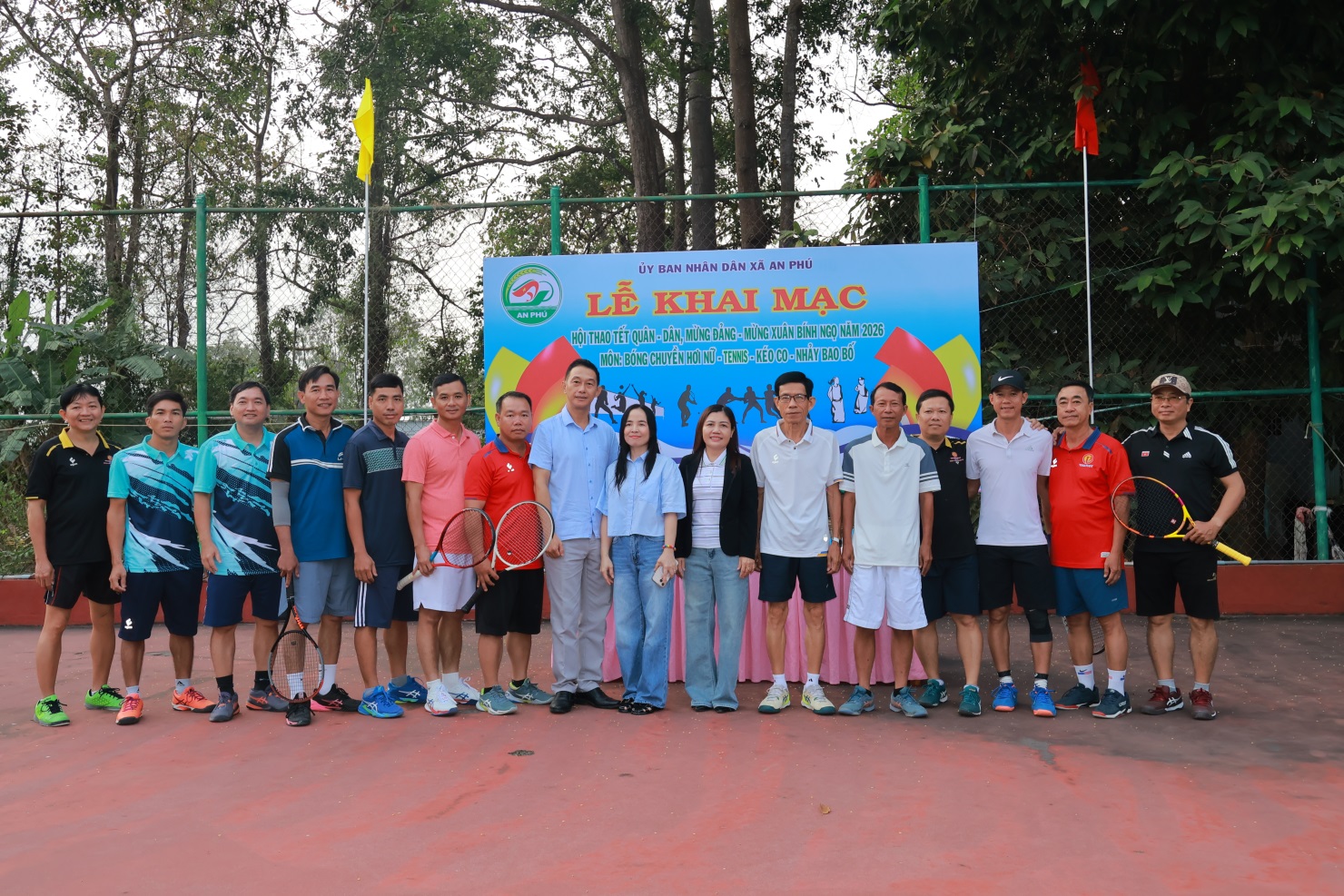 Sáng 08/02, trong chuỗi hoạt mừng Đảng, mừng Xuân Bính Ngọ năm 2026, tại sân Tennis xã An Phú, UBND xã An Phú tổ chức thành công Giải Tennis mở rộng; ông Lê Thanh Phương, Phó Bí thư Thường trực Đảng ủy, Giám đốc Trung tâm Chính trị xã An Phú đến dự và phát biểu khai mạc giải; ông Nguyễn Xuân Hải, nguyên Phó Chủ tịch UBND huyện An Phú; ông Nguyễn Văn Thao, nguyên Phó Chủ tịch UBND huyện An Phú đến dự.