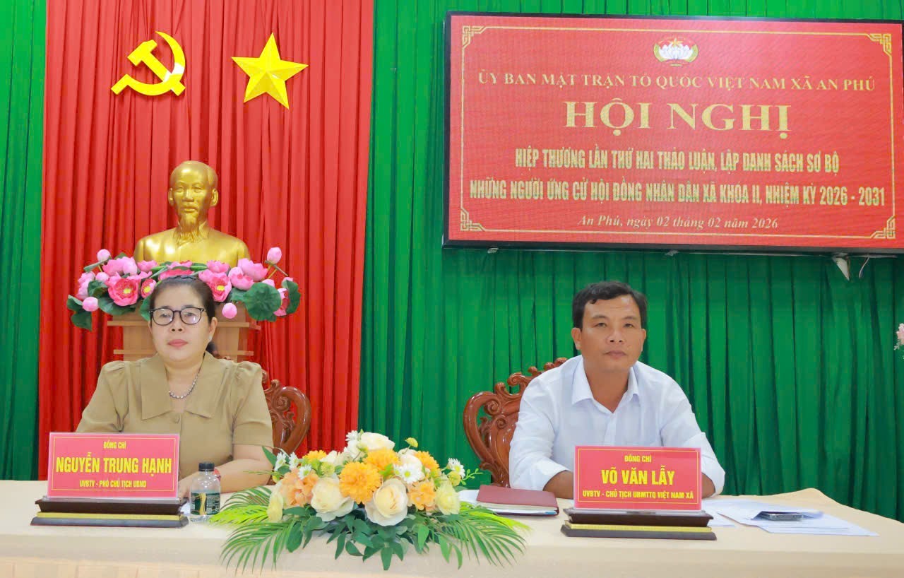 Chiều 2/2, tại Phòng họp trực tuyến Đảng ủy xã, Ủy ban Mặt trận Tổ quốc (MTTQ) Việt Nam xã An Phú tổ chức Hội nghị hiệp thương lần thứ 2, nhằm thảo luận và lập danh sách sơ bộ người ứng cử HĐND xã khóa II, nhiệm kỳ 2026 – 2031; bà Nguyễn Trung Hạnh, UVBTV Đảng ủy, Phó Chủ tịch UBND xã; ông Võ Văn Lẫy, UVBTV Đảng ủy, Chủ tịch Ủy ban MTTQ Việt Nam xã; bà Trần Thị Hương, UVBTV Đảng ủy, Phó Chủ tịch HĐND, Phó Chủ tịch Ủy ban bầu cử xã; cùng tổ chức thành viên của Ủy ban MTTQ Việt Nam xã tham dự hội nghị.