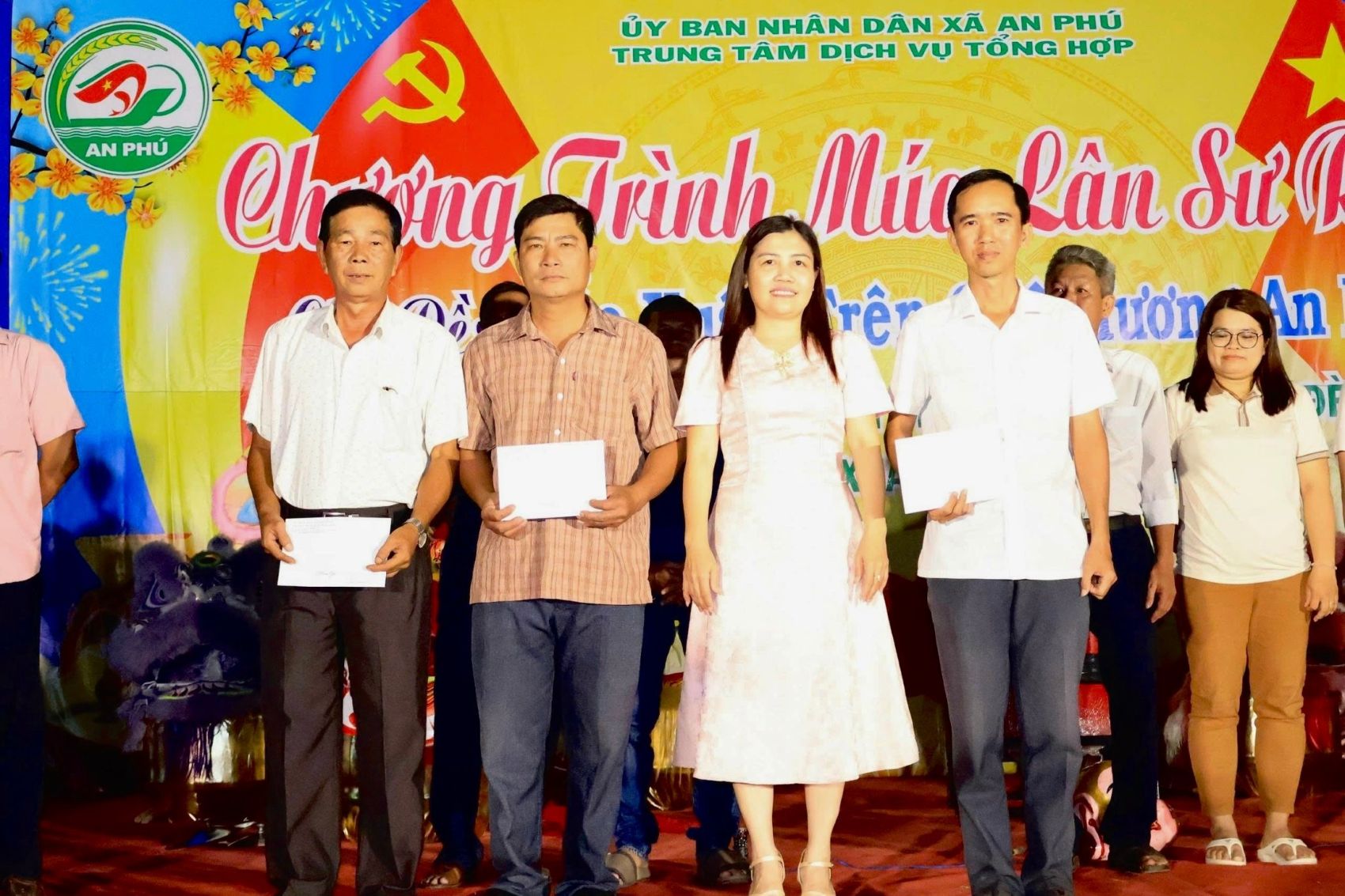 Bà Nguyễn Thị Thanh Thúy, Giám đốc Trung tâm Dịch vụ tổng hợp, Phó Ban tổ chức Hội thi trang trí và treo lồng đèn xã An Phú trao giải phong trào cho các ấp
