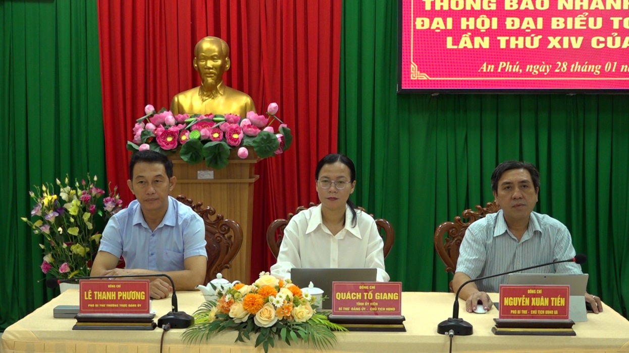 Sáng 28/1, Ban Tuyên giáo và Dân vận Trung ương tổ chức Hội nghị báo cáo viên Trung ương tháng 1/2026, thông báo nhanh kết quả Đại hội đại biểu toàn quốc lần thứ XIV của Đảng theo hình thức trực tiếp kết hợp trực tuyến; tại điểm cầu xã An Phú, Tỉnh ủy viên, Bí thư Đảng ủy, Chủ tịch HĐND xã An Phú Quách Tố Giang chủ trì hội nghị.