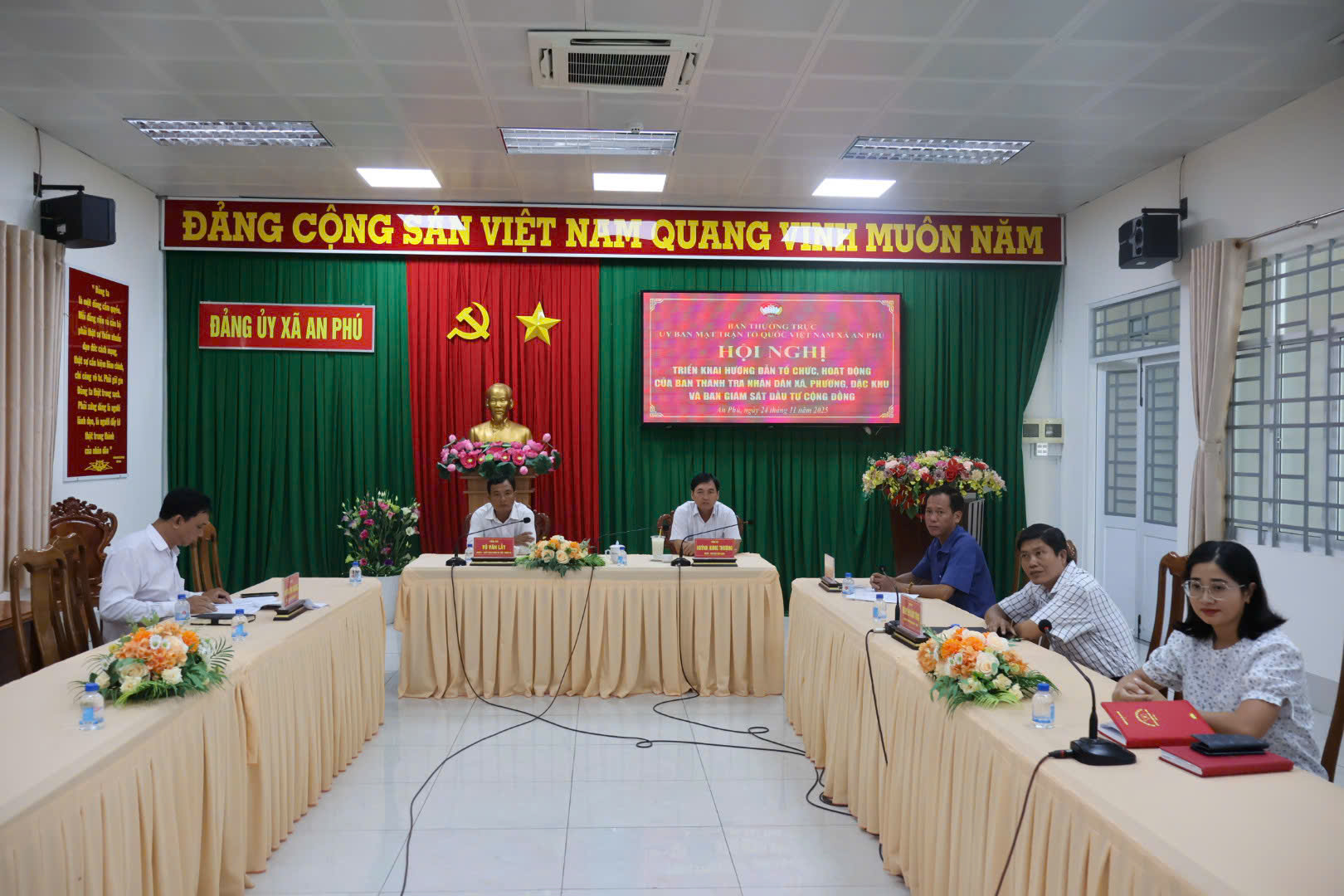 Chiều 24/11, Ban Thường trực Ủy ban MTTQ Việt Nam tỉnh An Giang tổ chức Hội nghị triển khai hướng dẫn tổ chức, hoạt động của Ban Thanh tra nhân dân xã, phường, đặc khu và Ban Giám sát đầu tư của cộng đồng bằng hình thức trực tiếp kết hợp trực tuyến; tại điểm cầu xã An Phú, ông Võ Văn Lẫy, Chủ tịch Ủy ban MTTQ Việt Nam xã; ông Huỳnh Hưng Thượng, Chủ tịch UBND xã; cùng đại diện lãnh đạo các phòng, ban tham dự.