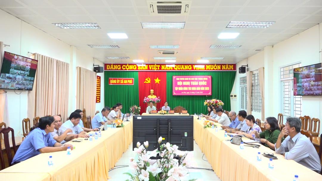 Sáng 12/11, Ban Tuyên giáo và Dân vận Trung ương tổ chức Hội nghị trực tuyến toàn quốc tập huấn công tác khoa giáo năm 2025; tại điểm cầu xã An Phú, đồng chí Quách Tố Giang, Tỉnh ủy viên, Bí thư Đảng ủy, Chủ tịch HĐND xã; đồng chí Lê Thanh Phương, Phó Bí thư Thường trực Đảng ủy xã tham dự hội nghị.