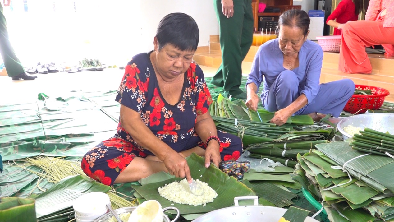 Bí thư Đảng uỷ xã An Phú Quách Tố Giang cùng chị em phụ nữ và chiến sĩ gói bánh tét
