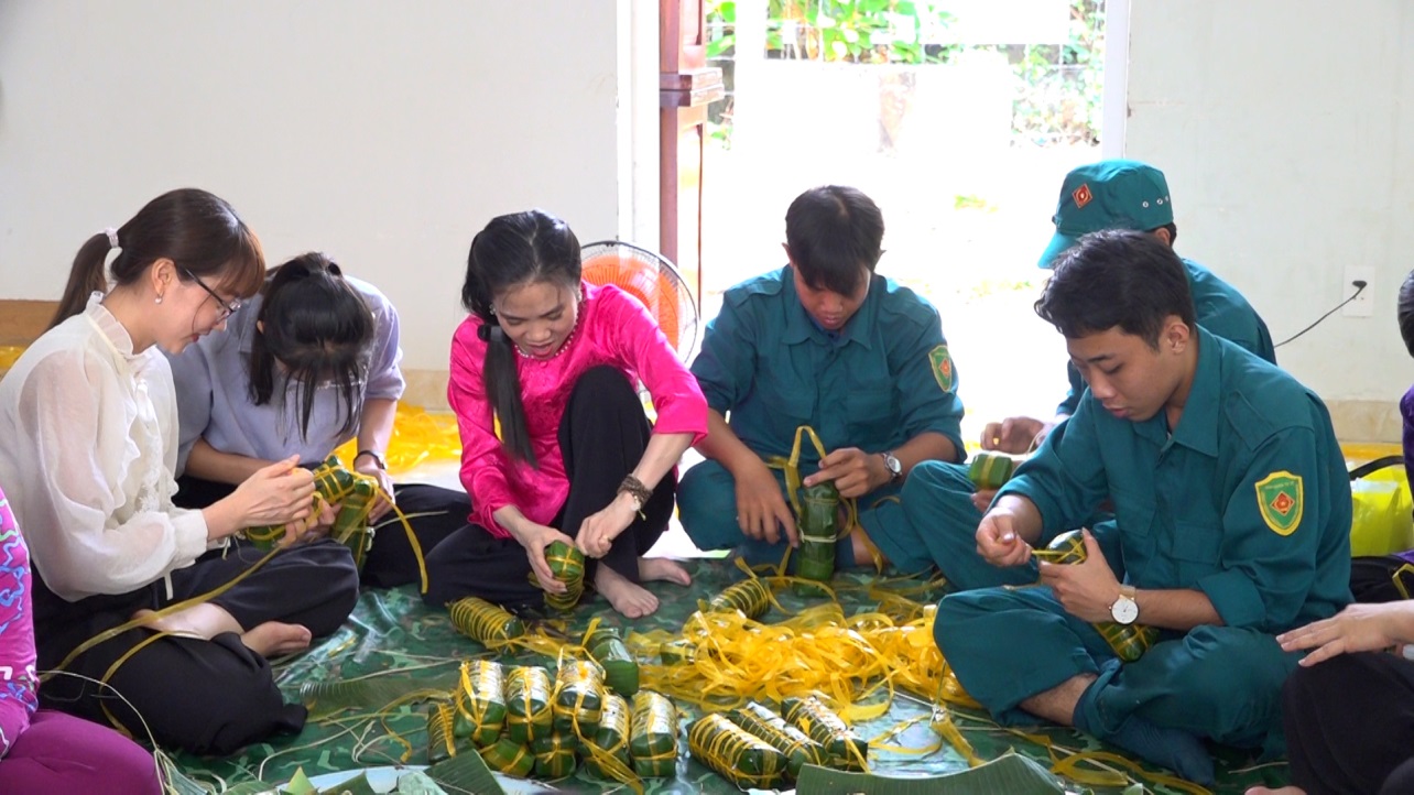 Các chiến sĩ và chị em phụ nữ tham gia gói bánh tét