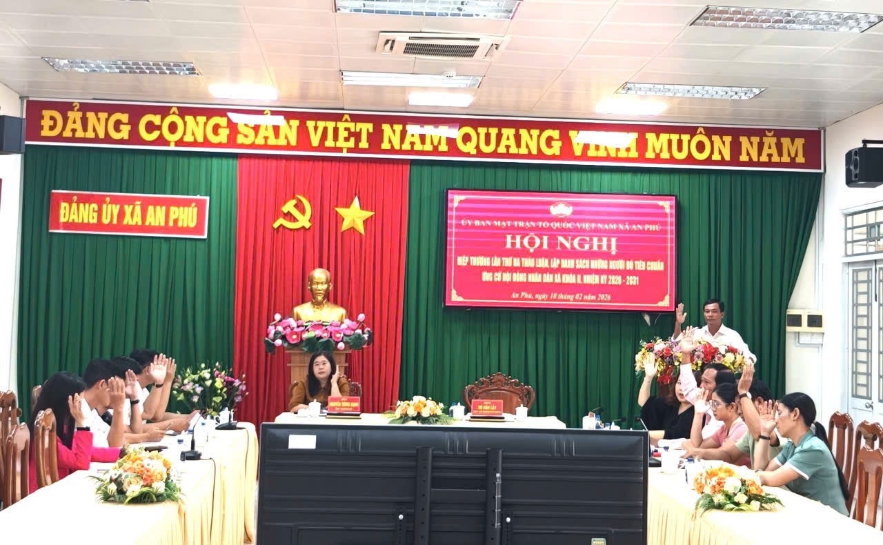 Thực hiện các quy định của Luật bầu cử đại biểu Quốc hội và đại biểu Hội đồng nhân dân(HĐND), chiều 10/2, Ban Thường trực Ủy ban Mặt trận Tổ quốc(MTTQ) Việt Nam xã An Phú đã tổ chức hội nghị hiệp thương lần thứ Ba, nhằm thỏa thuận, lập danh sách những người đủ tiêu chuẩn ứng cử đại biểu HĐND xã khóa II, nhiệm kỳ 2026 – 2031; bà Nguyễn Trung Hạnh, UVBTV Đảng ủy, Phó Chủ tịch UBND xã; ông Võ Văn Lẫy, UVBTV Đảng ủy, Chủ tịch Ủy ban MTTQ Việt Nam xã chủ trì hội nghị.