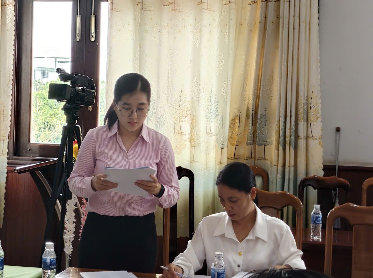 Đại diện Phòng giao dịch NHCSXH An Phú thông qua báo cáo tại hội nghị