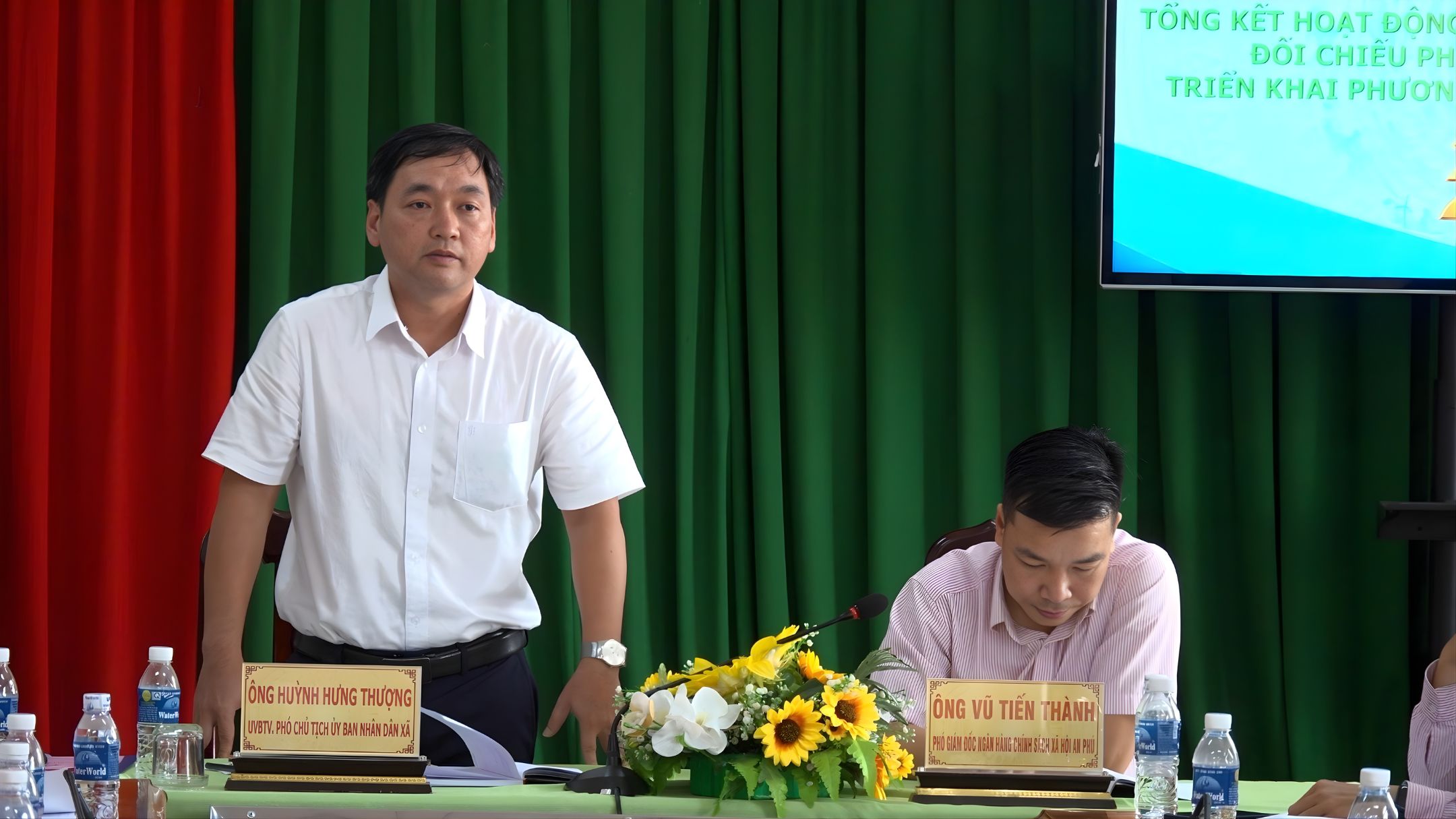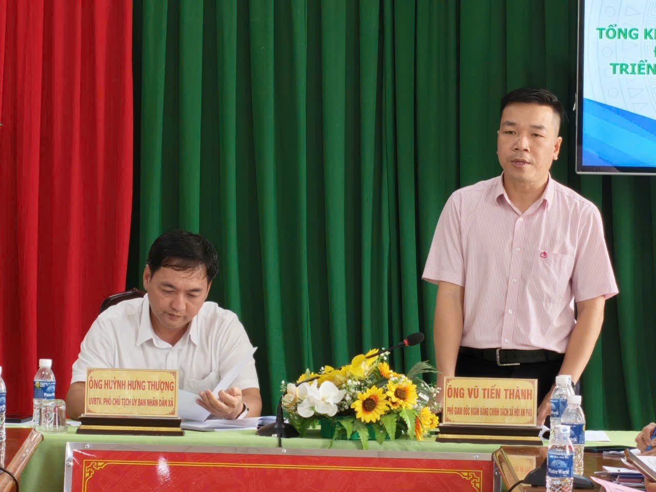Ông Huỳnh Hưng Thượng, Phó Chủ tịch UBND xã An Phú; ông Vũ Tiến Thành, Phó Giám đốc Phòng giao dịch NHCSXH An Phú chủ trì hội nghị