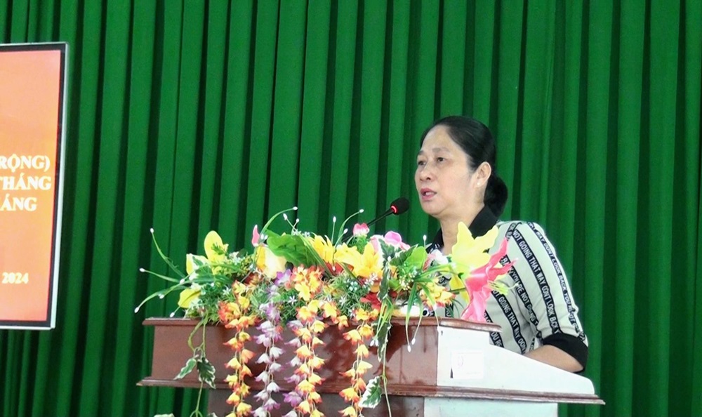 Bà Lê Huệ Yến, Bí thư Đảng ủy, Chủ tịch UBND xã phát biểu tại hội nghị