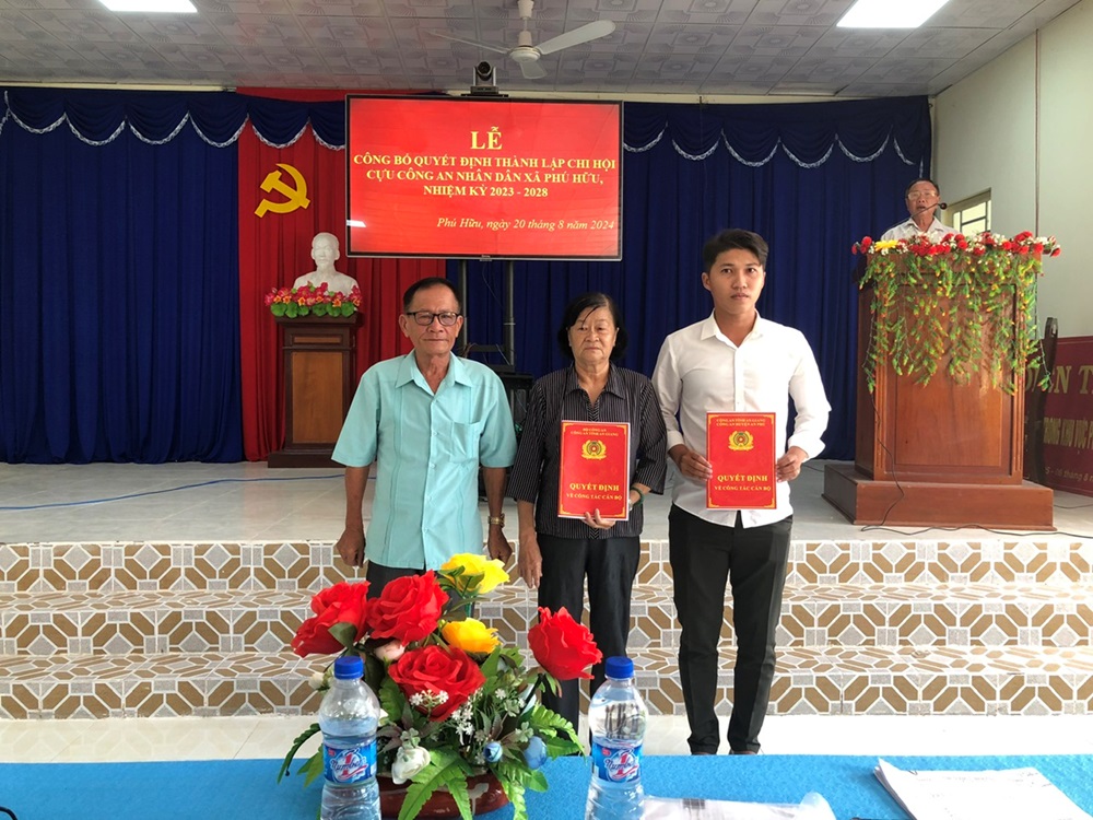 Theo đó, Hội Cựu Công an nhân dân huyện An Phú quyết định thành lập Chi hội Cựu Công an nhân dân xã Phú Hữu gồm 06 đồng chí; chỉ định đồng chí Nguyễn Huệ Hồng, Hội viên Hội Cựu Công an nhân huyện An Phú giữ chức vụ Chi hội trưởng; đồng chí Cao Đức Huy, Hội viên Hội Cựu Công an nhân huyện An Phú giữ chức vụ Chi hội phó.