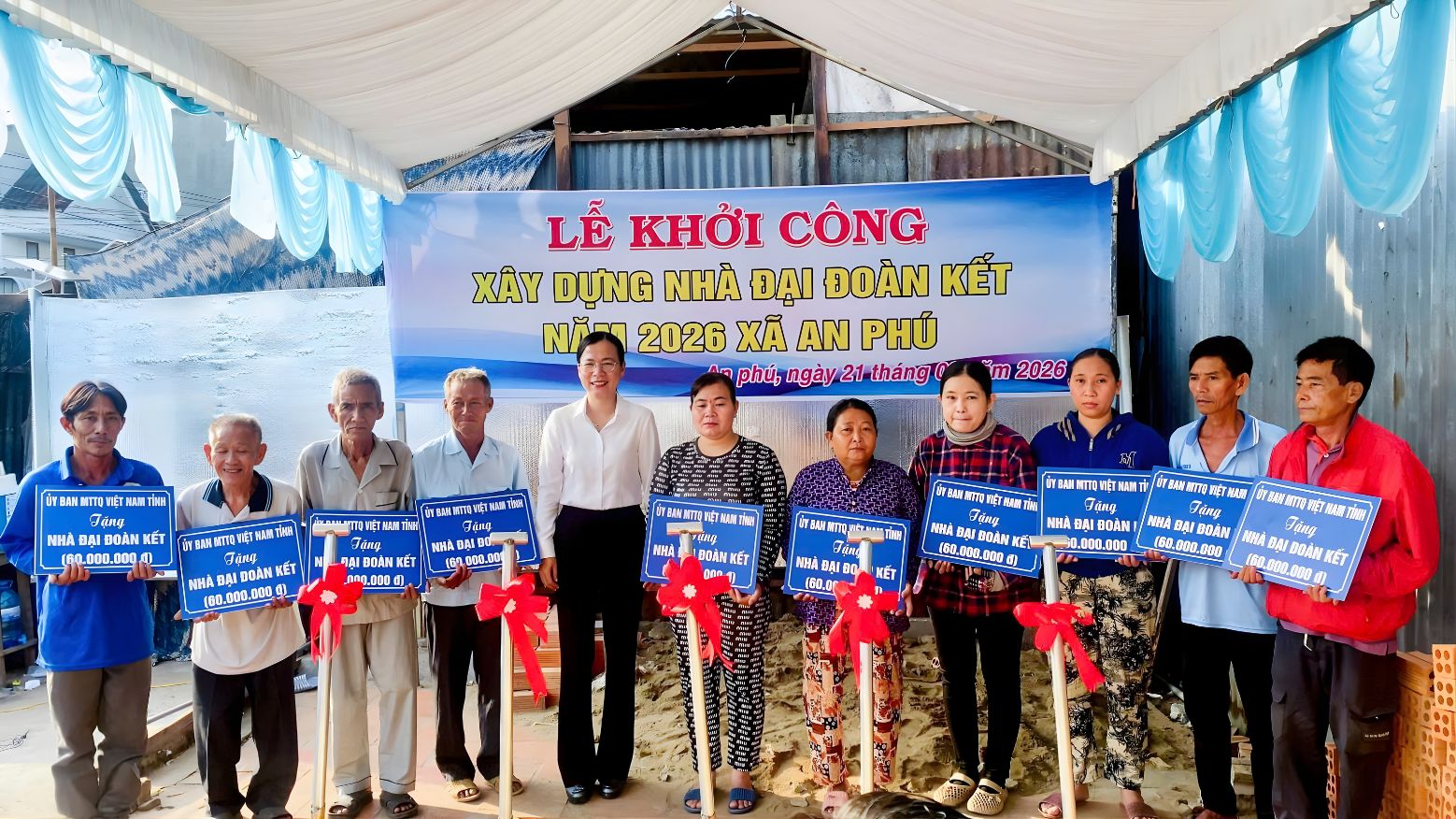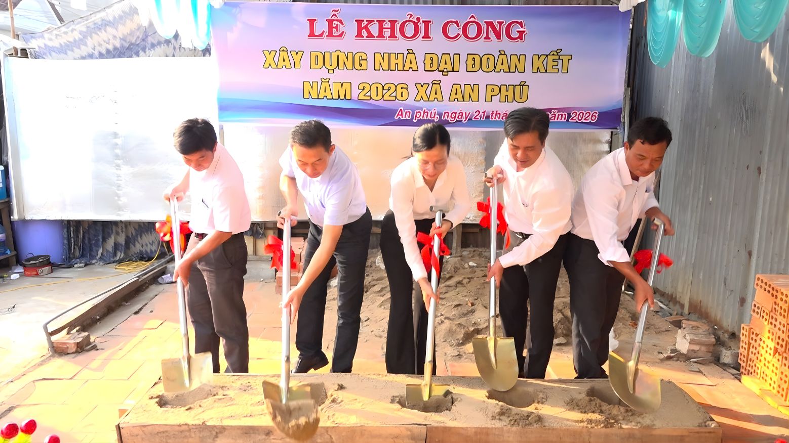 Sáng 21/1, Đảng ủy - UBND - Ủy ban MTTQ Việt Nam xã An Phú tổ chức Lễ khởi công xây dựng 10 căn nhà Đại đoàn kết cho hộ nghèo, hộ khó khăn về nhà ở. Mỗi căn trị giá 60 triệu đồng, do Công ty TNHH MTV Xổ số kiến thiết (XSKT) An Giang hỗ trợ đợt 2; bà Quách Tố Giang, Tỉnh ủy viên, Bí thư Đảng ủy, Chủ tịch HĐND xã An Phú; Thường trực Đảng ủy – HĐND – UBND – UBMTTQVN xã; các ban ngành, đoàn thể, cùng đại diện các hộ dân được hỗ trợ nhà đến dự.