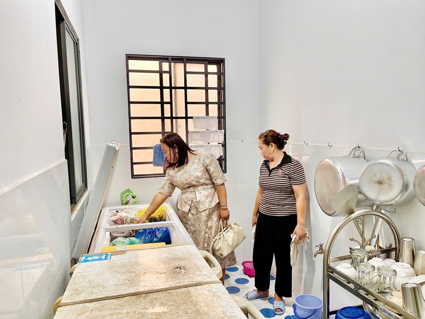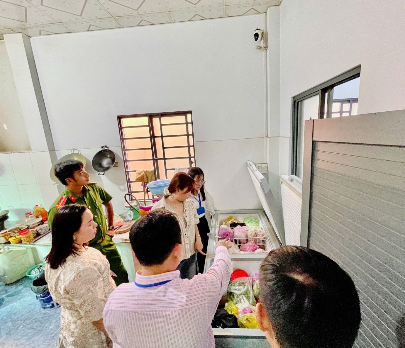 Đoàn kiểm tra đang tiến hành kiểm tra việc bảo quản nguyên liệu của quán