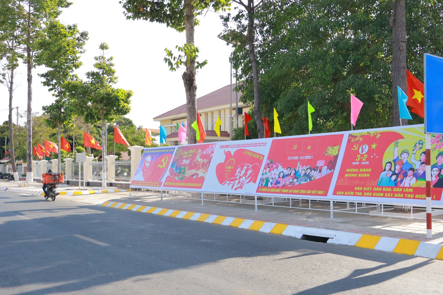 Panô tuyên truyền và treo Cờ nước trước cổng Đảng ủy xã An Phú
