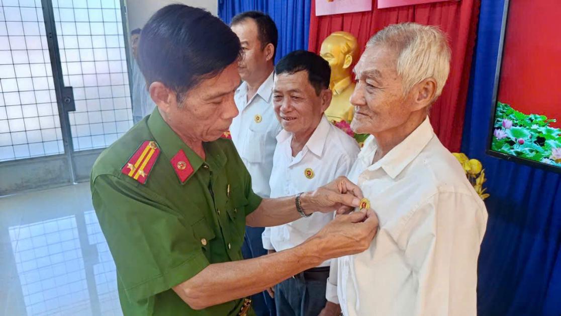 Trung tá Hồ Văn Hồng Hài, Phó trưởng Công an xã An Phú (bìa phải) trao huy hiệu Cựu CAND cho lãnh đạo chi hội