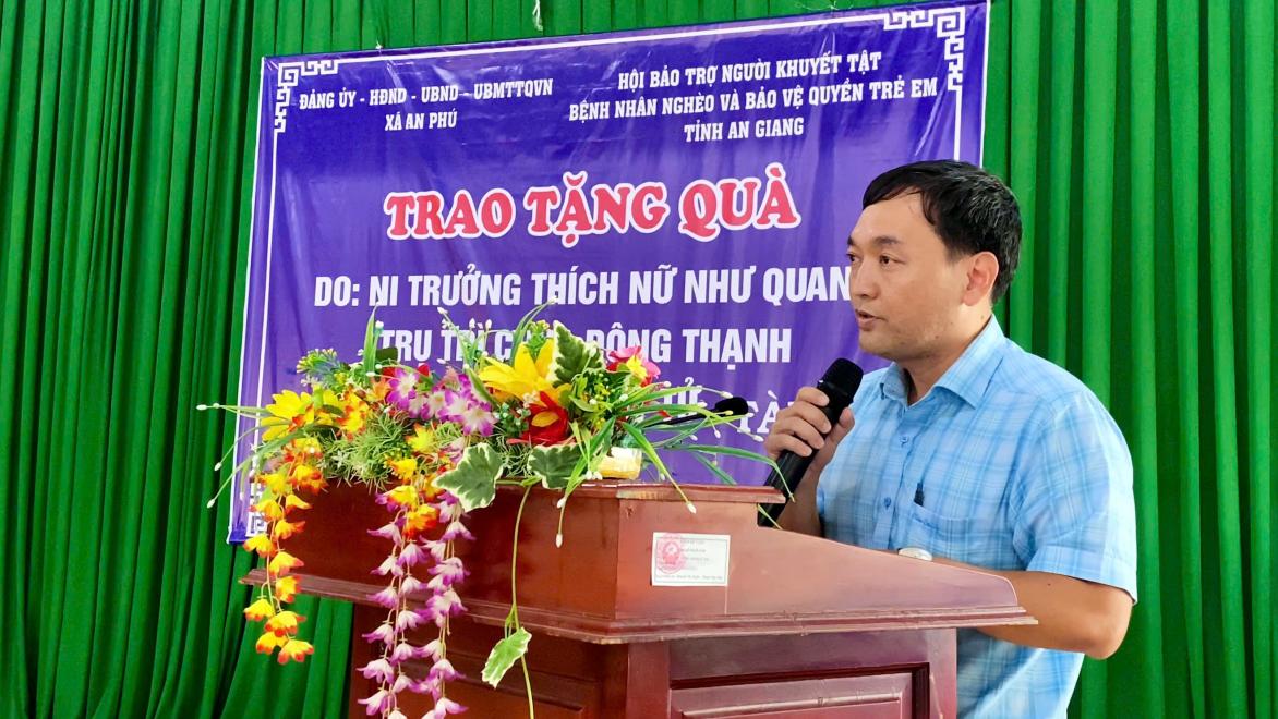 Phát biểu tại buổi trao quà, ông Huỳnh Hưng Thượng, UVBTV Đảng ủy, Phó Chủ tịch UBND xã An Phú trân trọng cảm ơn sự quan tâm hỗ trợ của Ni trưởng Thích nữ Như Quang và các phật tử Chùa Đông Thạnh. Phó Chủ tịch UBND xã mong muốn, thời gian tới, Ni trưởng Thích nữ Như Quang tiếp tục đồng hành cùng địa phương trong công tác an sinh xã hội để các đối tượng yếu thế có thêm động lực vượt qua khó khăn, vươn lên trong cuộc sống.