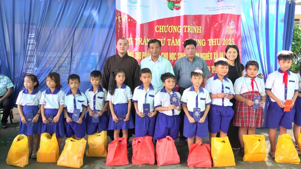 Lãnh đạo xã An Phú, nhà trường và đơn vị hỗ trợ trao quà cho học sinh nghèo