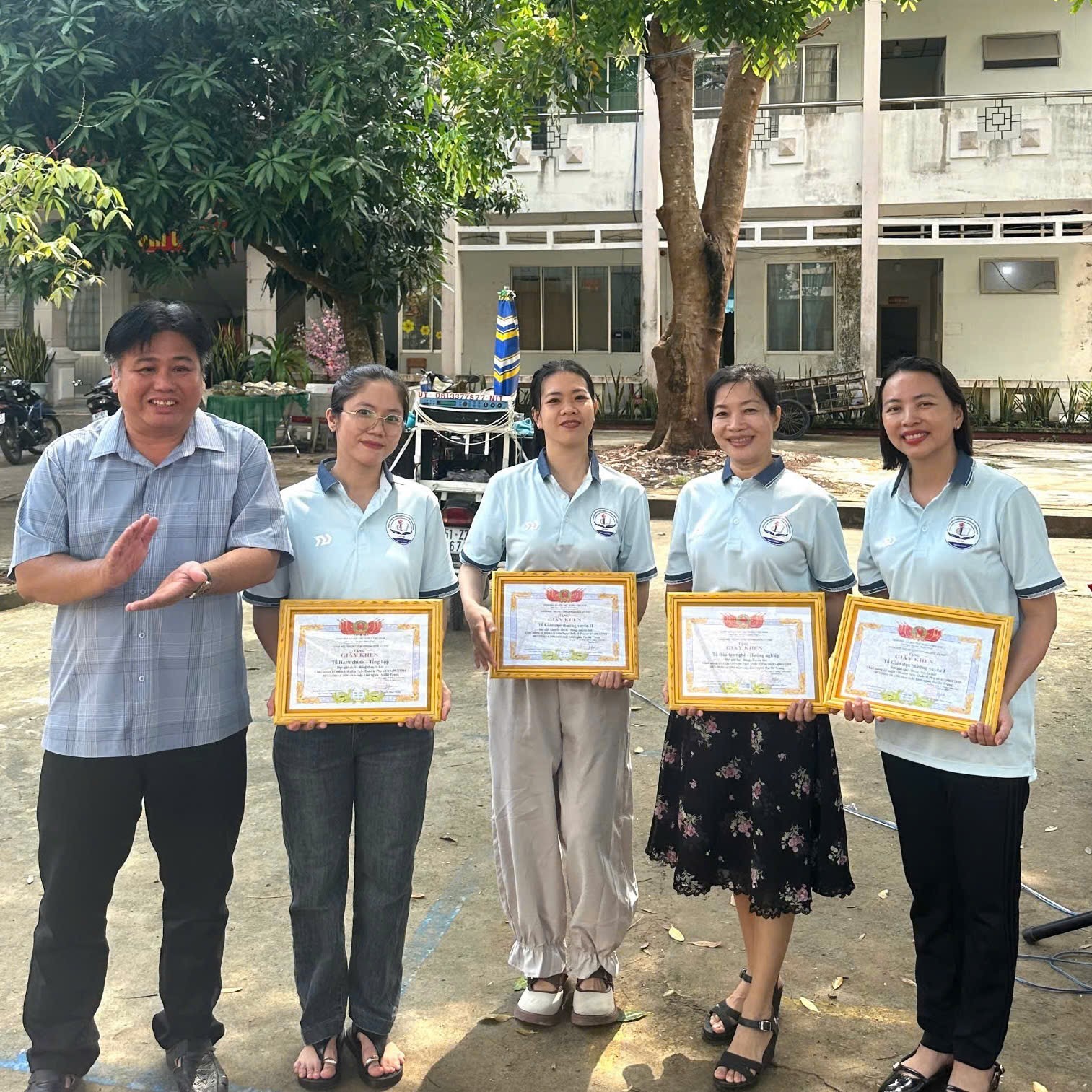 Ông Nguyễn Minh Phụng, Bí thư Chi bộ, Giám đốc Trung tâm Giáo dục nghề nghiệp và Giáo dục thường xuyên An Phú trao giải cho các đội đạt thành tích (ảnh: Phương)