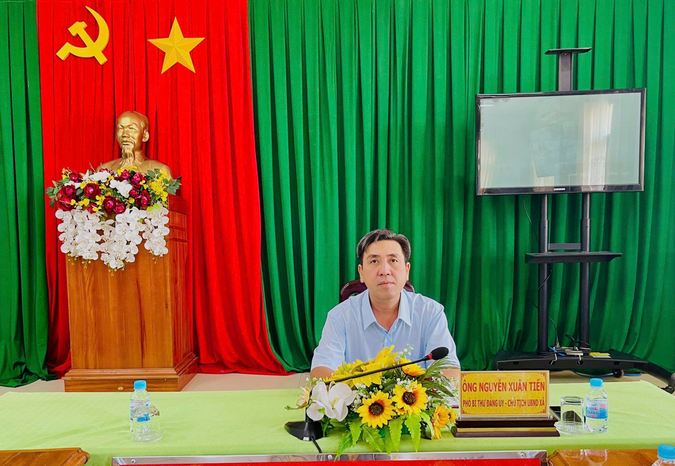 Đồng chí Nguyễn Xuân Tiến, Phó Bí thư Đảng ủy xã, Chủ tịch UBND xã chủ trì hội nghị tại điểm cầu xã An Phú
