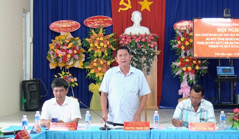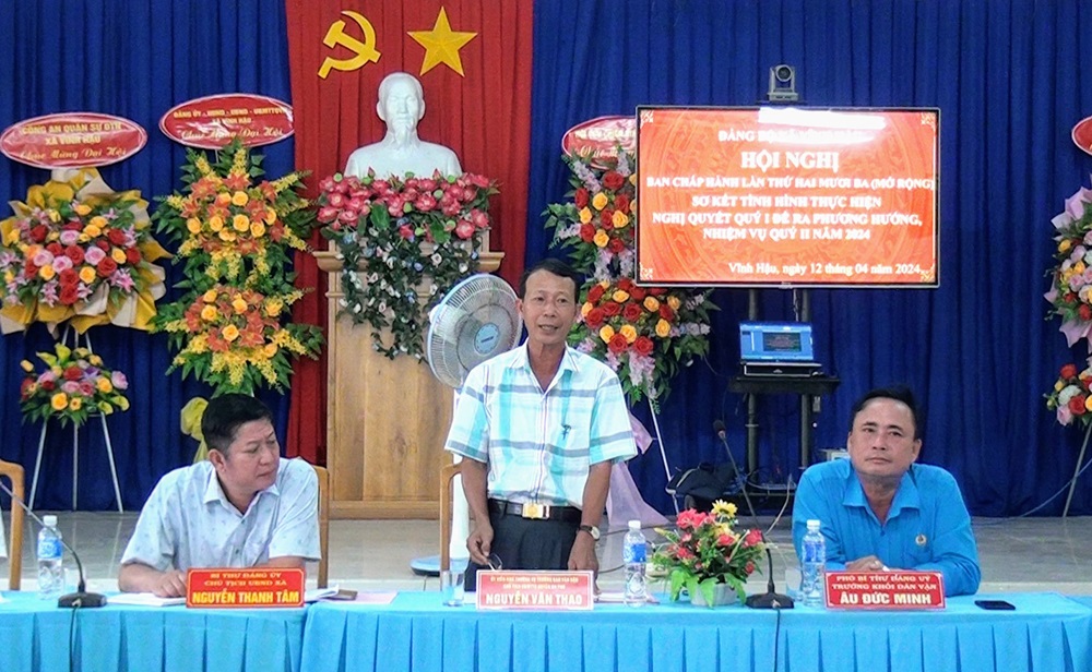 Chiều 12/4, Ban Chấp hành Đảng bộ xã Vĩnh Hậu tổ chức Hội nghị lần thứ 23, sơ kết tình hình thực hiện Nghị quyết quý 1, triển khai nhiệm vụ quý 2 năm 2024; dự và chỉ đạo hội nghị có ông Nguyễn Văn Thao, Trưởng Ban Dân vận Huyện ủy, Chủ tịch UBMTTQVN huyện.